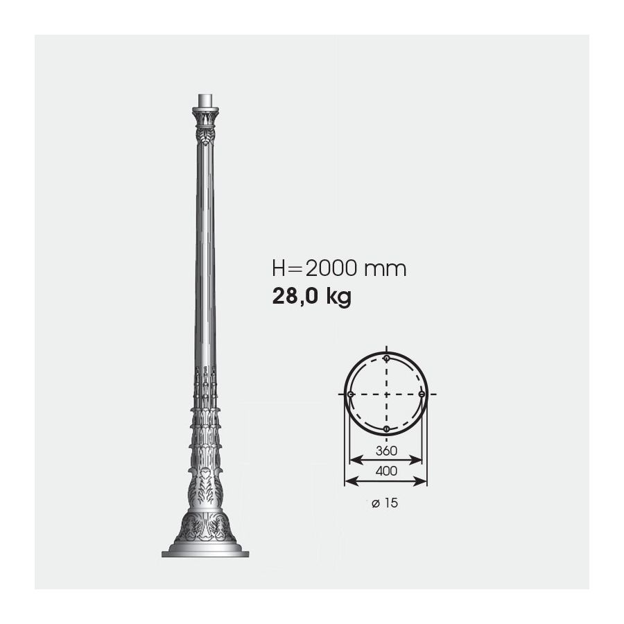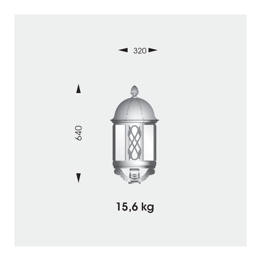 Denna eleganta klassiska lampa är designad av det tyska märket Robers, handgjord i smidesjärn och mundblåst glas. Den kombinerar viktorianska och gotiska element och blir en exklusiv armatur som passar alla miljöer. Rikligt utsmyckad med en karvad pelare som bär en lyktaformad hexagonal skärm. Huvuduppmärksamheten riktas mot ramen av tvistade järnstänger. Lampskärmen av mundblåst glas är tonad med en antik finish, täckt av ett lakoniskt tak med en traditionell knopp. Pollarlampan är utformad för hållbarhet och är vattenavvisande. Dess över genomsnittliga höjd gör det möjligt att belysa ett större område.