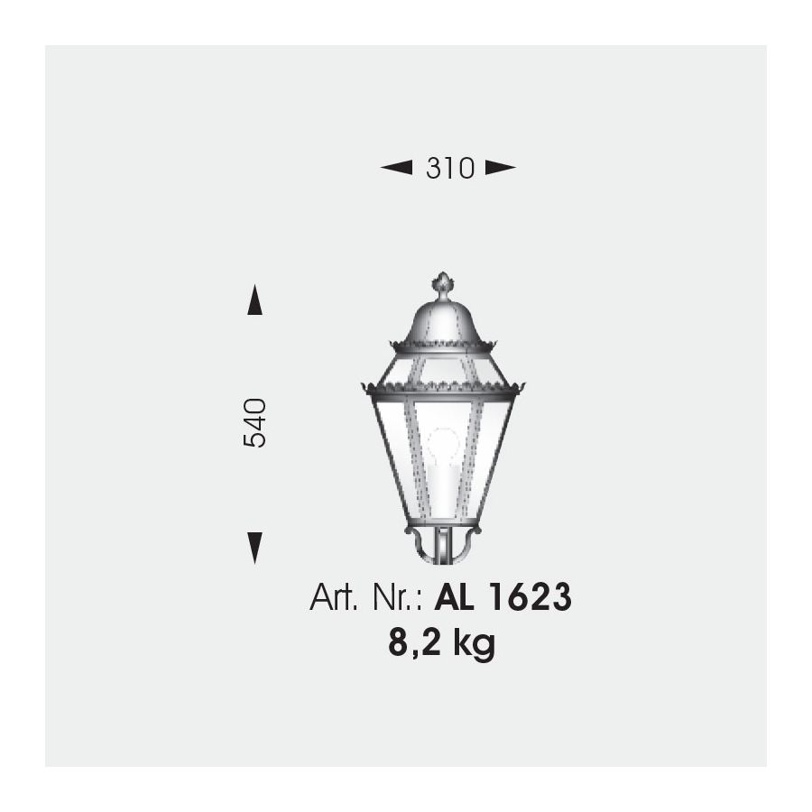 Vägglampan från utomhussamlingen av Robers (Tyskland) utmärker sig genom sin majestätiska och eleganta design som blir en vacker dekoration samtidigt som den tjänar som en pålitlig ljuskälla. Dess skärm är tillverkad av fasat glas tonat i en antik finish och täckt av ett tvålagers tak som delvis består av glas. En sådan lösning gör att lampan ger mer ljus uppåt och utåt. Skärmen inkluderar en nedre hållare för en lampa. Dess rektangulära bakplatta är lätt utsmyckad och förbinds med skärmen genom en massiv karvad arm. Armaturen finns i en av 10 ytbehandlingar för att perfekt matcha utomhusmiljön. Hållbar och vattenbeständig.