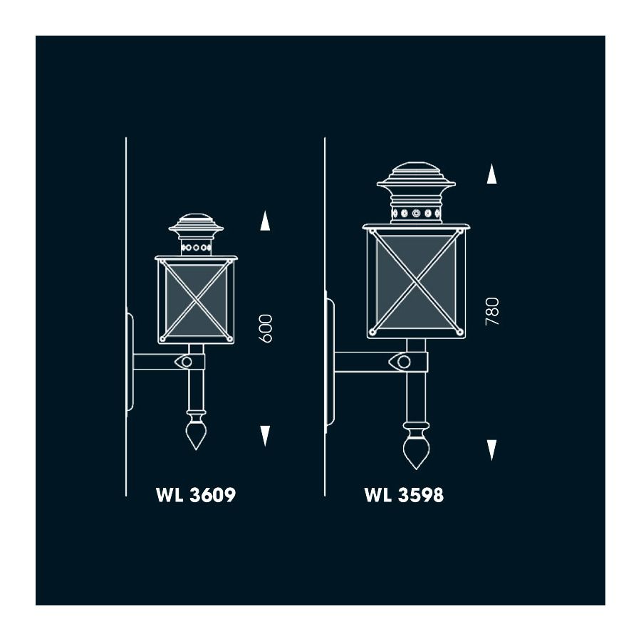 Denna vägglampa har en exceptionell design som kombinerar kännetecken från Classic och Medieval stilar. Det är en lyktliknande armatur i fyrkantig form. Varje sandblästrad ruta med en antik finish är dekorerad med korsade järnstänger och krönt med en stor baldakin. De ventilationshål på taket visar att lampan är utformad som en version av en lykta.
