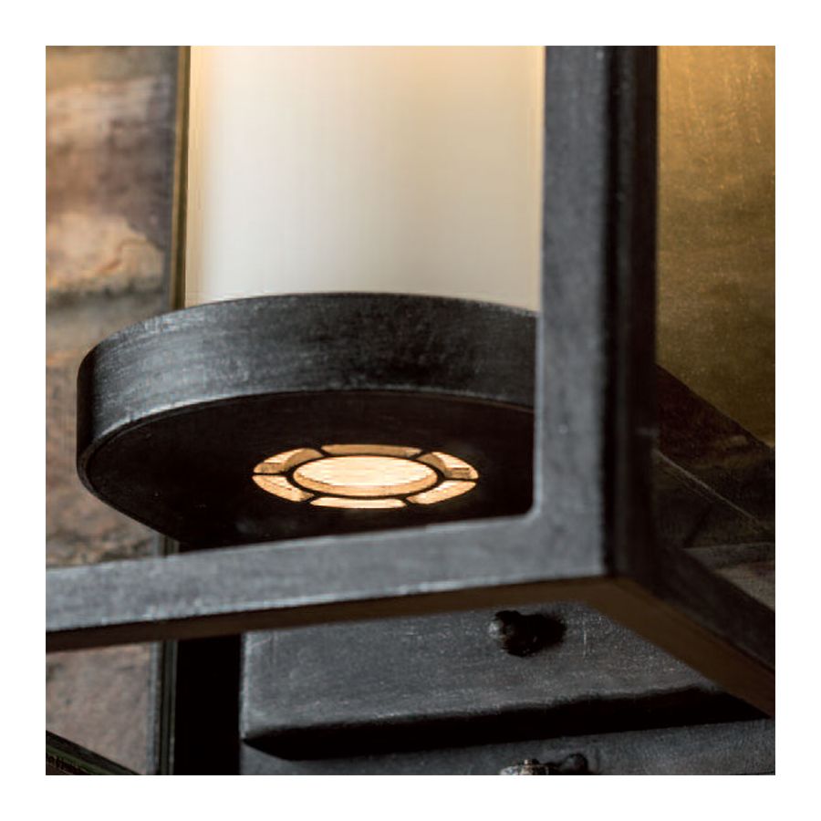 Denna vägglampa i samtida stil kännetecknas bäst av en utsökt blandning av stämningar. Här ser du influensen från klassiska lyktor omarbetade med moderna idéer. Dess huvudsakliga drag är lampskärmen skapad som en knopp av en vildblomma med dess typiskt förlängda form och kanter. Hantverkarna använder blåst glas med opalfinish för en mer autentisk ljusliknande design. Den runda ljuskoppen med den transparenta botten och en extra downlight tillåter ljuset att tränga igenom den med mjuka strålar. Hållaren är fäst direkt på bakplattan, båda är tillverkade av smidesjärn, liksom ramen. Den bottenmonterade lampan finns i en av 10 ytbehandlingar, applicerade manuellt.