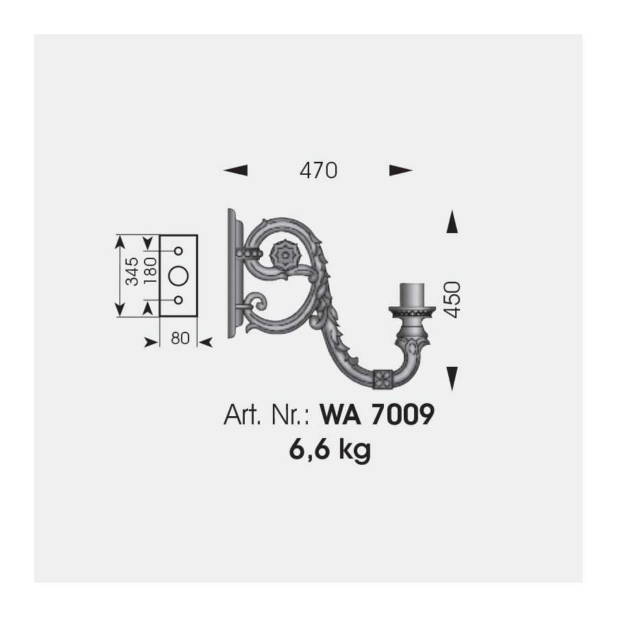 Denna eleganta utomhusvägglampa från det tyska märket Robers utmärker sig med sina mjuka linjer och dekorativa element. Den vackert böjda armen är fäst vid bakplattan med två nitar. Både armen och armens baksida är dekorerade med blomelement som vi hittar i andra armaturer från denna serie. Fästet och lampskärmen har samma dekor i ornamentstil. Den är krönt med en dekorknopp. Hela lampan är tillverkad av smidesjärn, för hand.