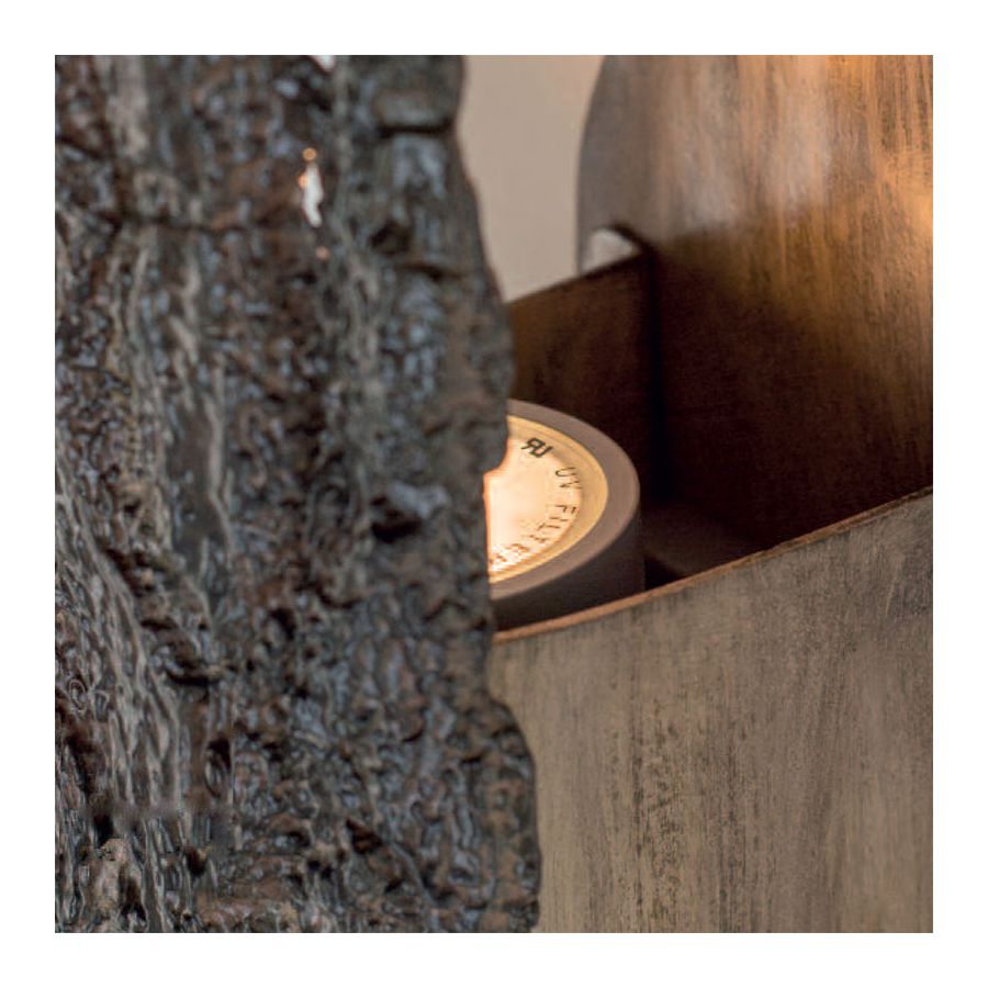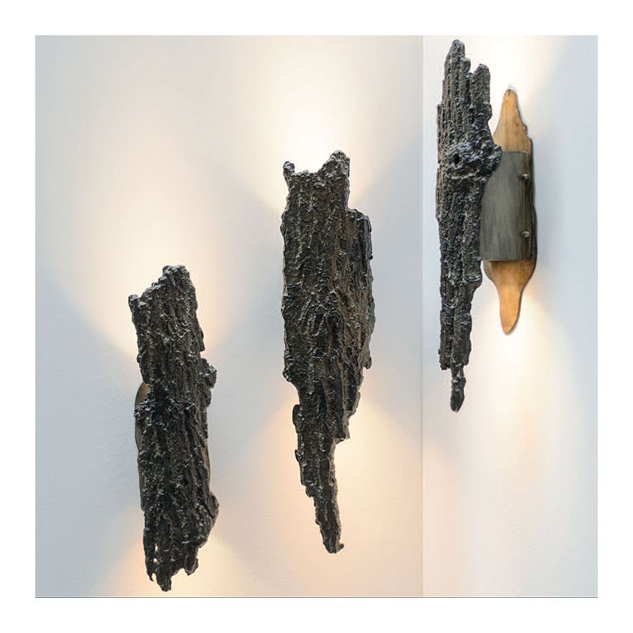Denna unika vägglampa blir ett verkligt statement för varje utomhusmiljö. Designerna från det tyska märket Robers skapar den av järn, helt efterliknande barken på ett träd. Bakplåten ser ut som en planka i sin abstrakta form. Lampans stora arm är fäst vid bakplåten med flera nitar som fungerar som dekoration. Skärmen efterliknar trädets bark med ojämna rundade kanter bakom vilka vi ser två ljuskällor. Deras ljus reflekteras både från skärmen och bakplåten och sprider sig runtom i varma strålar.