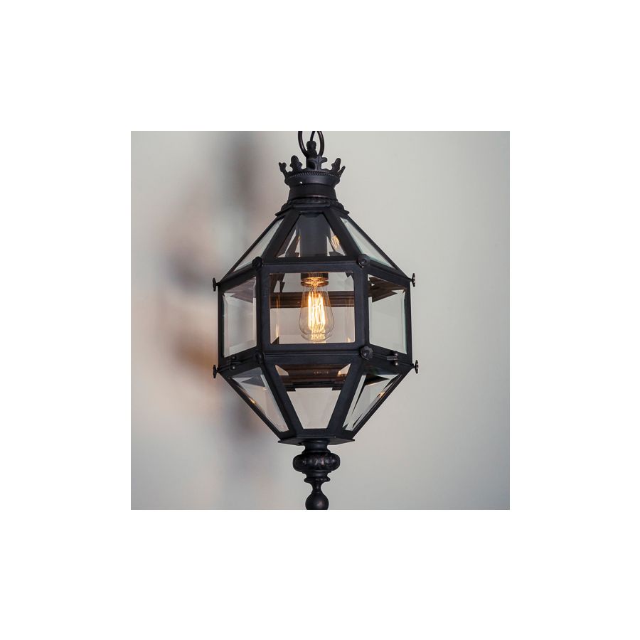 Handtillverkad i Tyskland är denna pendel tillverkad av högkvalitativt smidesstål och avslutad med noggrann omsorg om detaljerna. De klara, fasetterade glaspanelerna förstärker ljusets lyskraft och skapar ett varmt och stämningsfullt sken samtidigt som de framhäver armaturens intrikata konstruktion.
