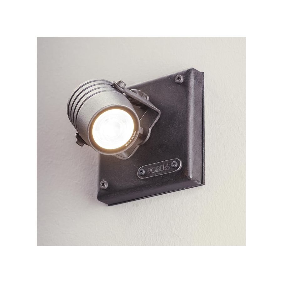 Handgjord i Tyskland i massivt smidesjärn med en skyddande ytbehandling återspeglar denna modell hållbarheten och äktheten i traditionellt metalarbete. Den rena, geometriska bakplattan kontrasterar mot det tekniska formen på strålkastarhuvudet och skapar en balanserad och strukturerad visuell komposition.