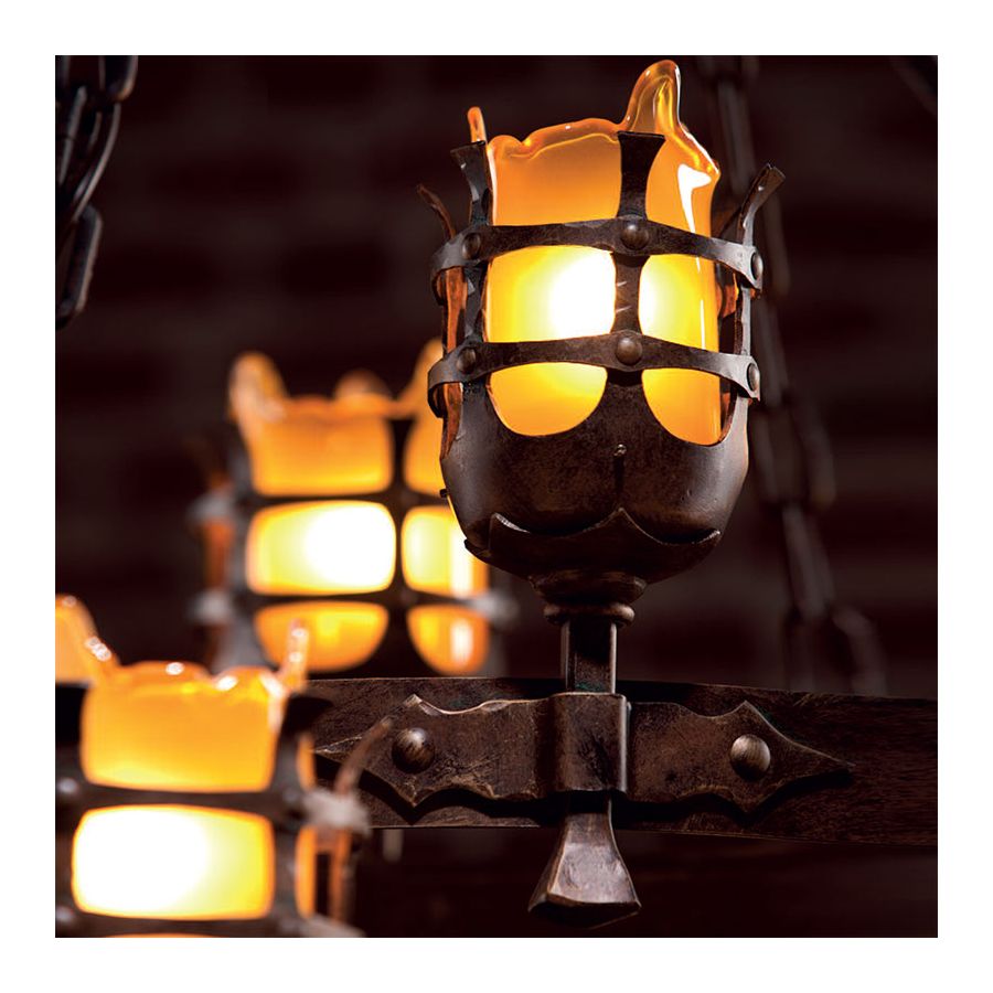Takpendel från kollektionen “Indoor-8” av Robers (Tyskland) är en av lösningarna i en kandelaber-stil från samma linje. Dessa lampor skiljer sig åt i storlek och några dekorativa detaljer. Takpendeln är tillverkad av smidesjärn på traditionellt vis - för hand. Glaslampskärmarna placeras i eleganta hållare, var och en är ansluten till basringen med ett rör. Dessa lampskärmar är ett annat element att lägga särskild vikt vid: var och en av de fyra är handgjord av frostat glas och har en effektfull form på kanterna. Basringen är fäst vid den slutliga takrosetten med kedjor. Designern föreslår 10 alternativ för basens ytbehandling, men behåller glaslampskärmen i en bärnstenston för att tillföra ett varmt och mysigt uttryck till hela designen.