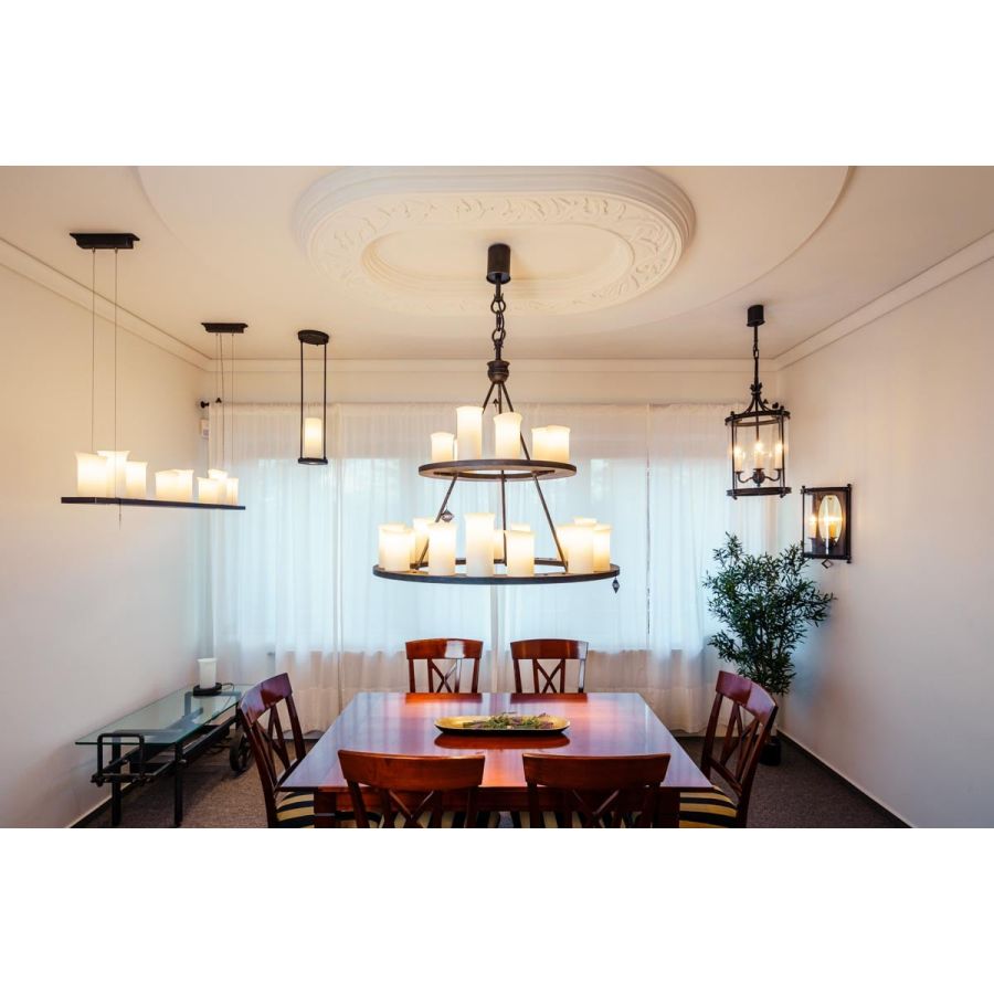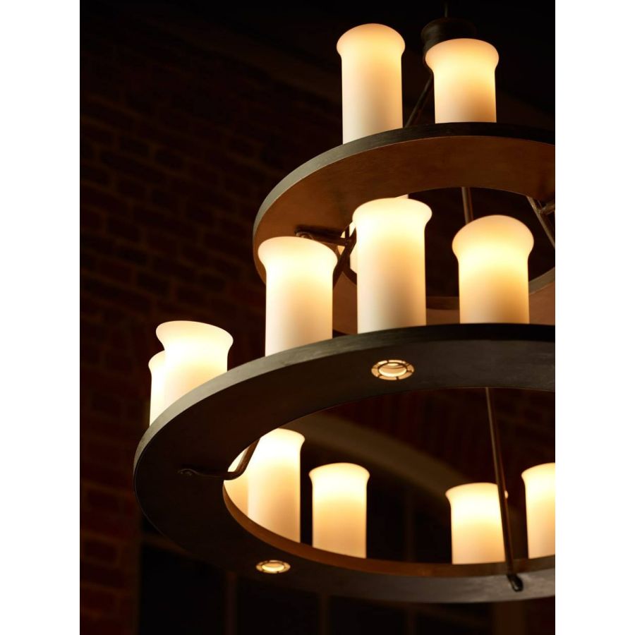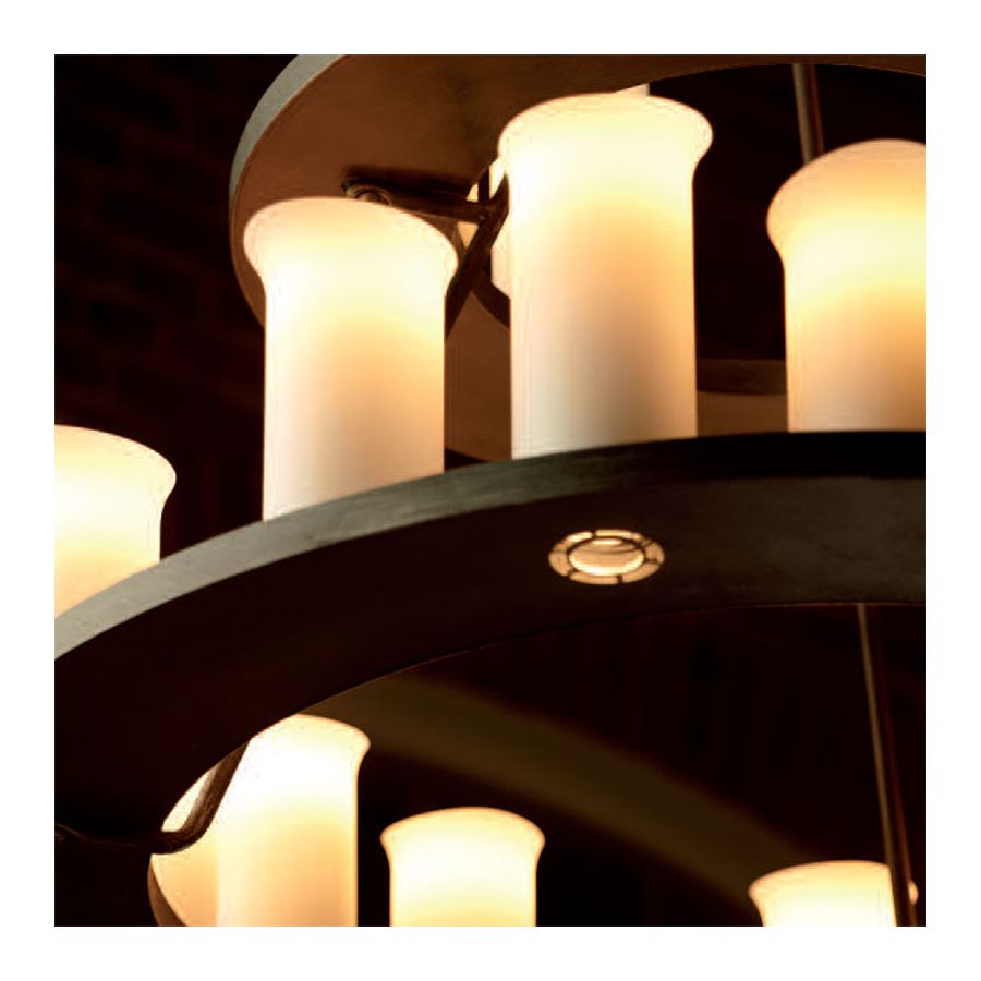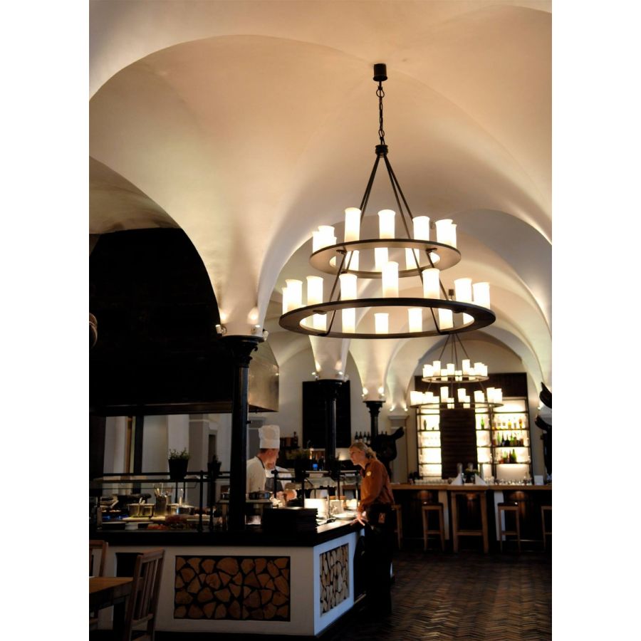 Denna enorma 2-lagers taklampa från “Indoor 2”-kollektionen av Robers (Tyskland) är en elegant lösning i hårt stål och glas. Det nedersta lagret inkluderar 8 lampor + 8 lampor och 3 downlights, det övre lagret - 5 lampor. Varje lampa är täckt av en glaskupa i opal matt finish, men skiljer sig i storlek. Basen, rördelarna, takrosetten och kedjorna är alla handgjorda i stål. Formgivarna erbjuder 10 alternativ för ytbehandling: från klassisk patina och antik mässing till gammal svart och silver. Ytbehandlingarna är också handgjorda. Därför kan slutresultatet skilja sig från fotot.