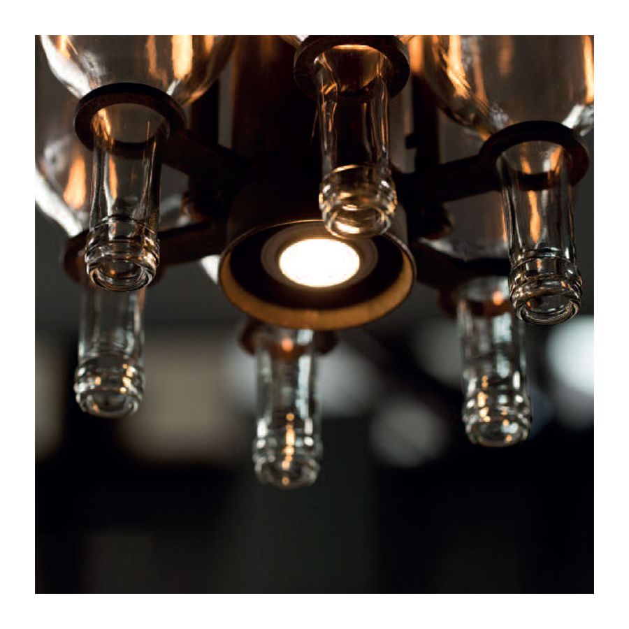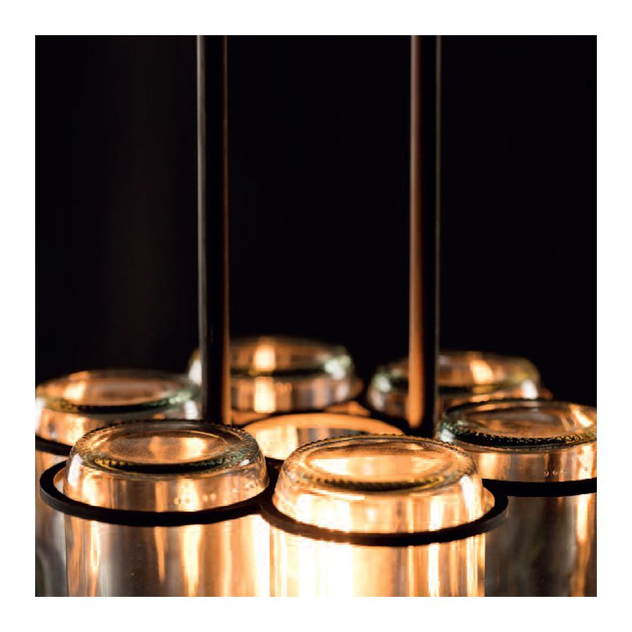Denna exklusiva hänglampa från Robers (Tyskland) kännetecknas av sin design. De klassiska lampskärmarna är ersatta av flaskor i klart glas, var och en i sin cell och alla tillsammans kombinerade i en cirkel. Röret, cellerna och takrosetten är gjorda av hårt stål som är traditionellt för hela kollektionen “Indoor 5”. Det centrala elementet är avsett för en glödlampa och en downlight: ljuset från glödlampan reflekteras från stålbasen och bryts genom glaset i flaskorna med vackra varma nyanser, medan downlighten belyser lampans nedre del. Som vanligt är hela designen lakonisk och handgjord. Varje detalj av lampan och ytbehandlingen är gjord för hand av varumärkets smeder. Den slutliga höjden på lampan tillverkas enligt kundens önskemål.
