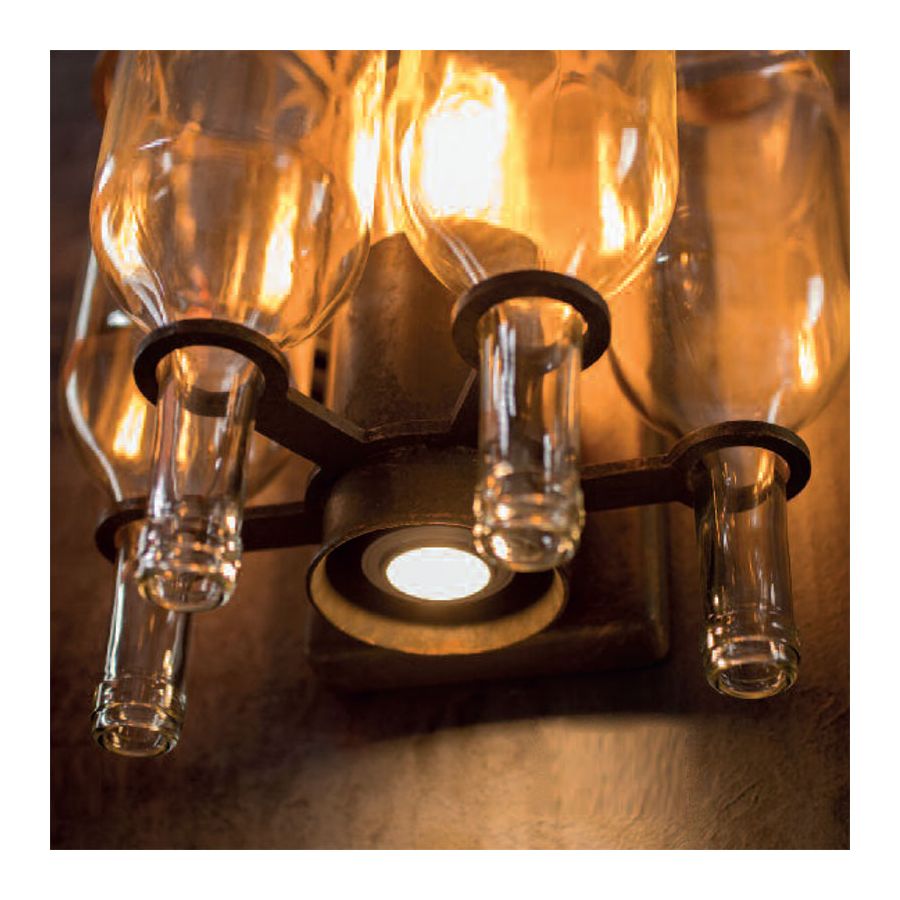 Vägglampan från kollektionen “Indoor 5” av det tyska märket Robers har en ovanlig design. Den klassiska lampskärmen är utbytt mot flaskor. Flaskorna är i munblåst glas med klar finish. Glödlampan är placerad i mitten av lampan. Dess ljus reflekteras från flaskorna och sprids i alla riktningar genom 4 flaskor. Detta ljus är alltid varmt och mjukt. Vägglampan är försedd med en downlight.