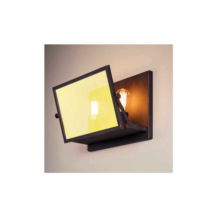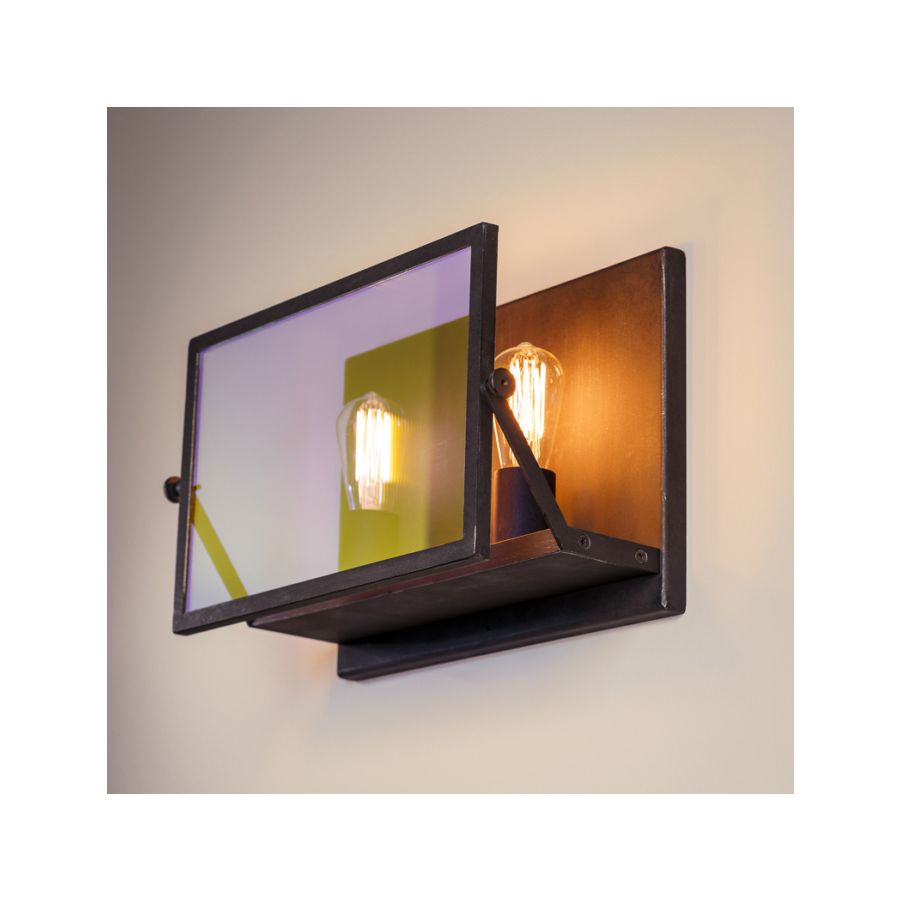 Den justerbara reflektorn med dikroiskt glas frambringar en dynamisk färgomskiftande effekt som växlar mellan varm guldfärg och sval blå ton beroende på betraktningsvinkel. I kombination med den råa texturen hos handsmidet metall ger armaturen både funktionell belysning och en stark visuell identitet.