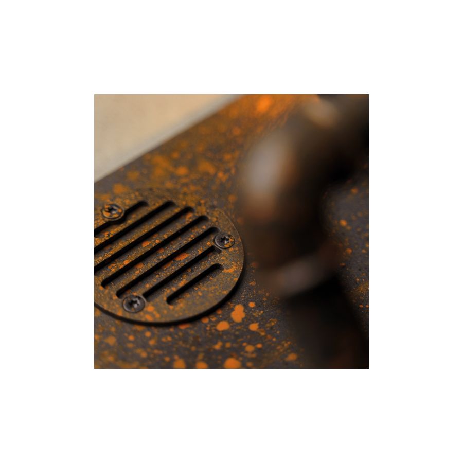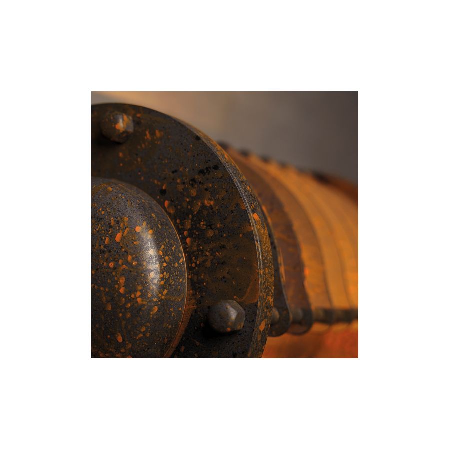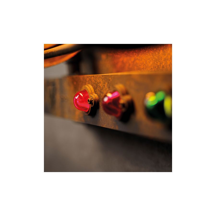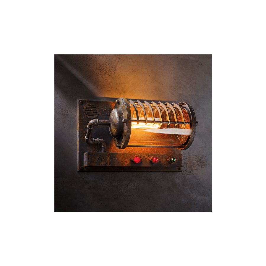 Tillverkad av massivt stål och skyddad av en glasomslutning, har armaturen ett djärvt metallgaller och tekniska detaljer inspirerade av vintage industriell ingenjörskonst. Den varma ljuskällan skapar djup och framhäver omgivande material och texturer.