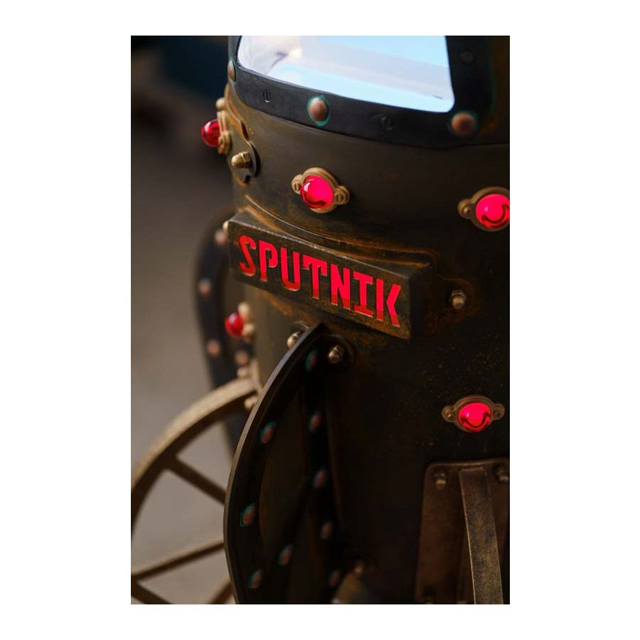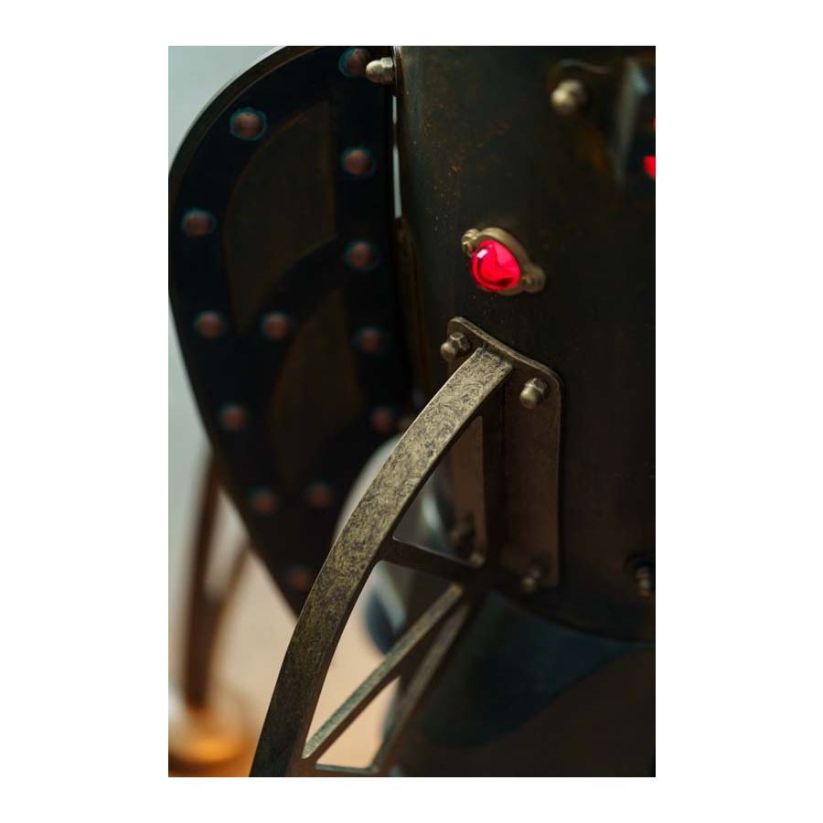 Den skulpturala metallkroppen definieras av nitade detaljer, kurvade former och precist utformade element som ger lampan en stark industriell karaktär. En fönsterlik öppning blottar den inre ljuskällan, vilket skapar djup och en subtil visuell berättelse, samtidigt som små accentdetaljer förstärker dess uttrycksfulla identitet.