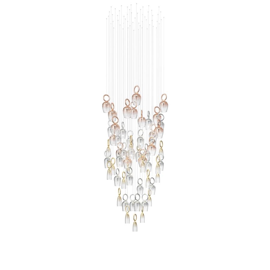 Exquisite design that plays with your perceptions. The CHIN CHIN collection is formed of crystal components shaped into golden drinks glasses, available in three playful designs – red wine, white wine, and champagne. Each piece is suspended from a flawless glass ring and finished with gradient nanocoating. The effect is a perfect paradox. The glasses look full but they are empty, they hang upside down but nothing spills. This design is both opulent and contemporary, creating a dramatic focal point for your interior.