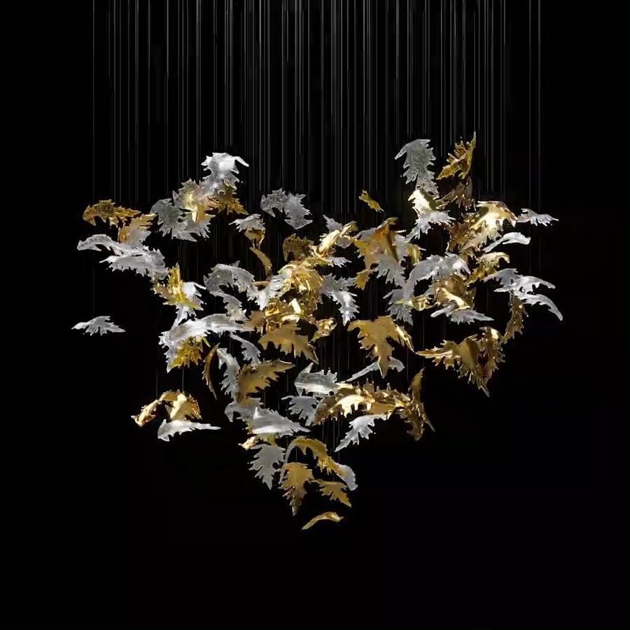 As the warm, gentle breezes of autumn lift and swirl leaves in a mesmerizing dance, the Flying Leaves collection captures this fleeting moment in time. Each piece is crafted from handblown crystal and meticulously shaped to reflect the beauty of autumn in nature. Suspended in a flowing arrangement, the collection embodies the delicate movement of leaves caught in the wind.