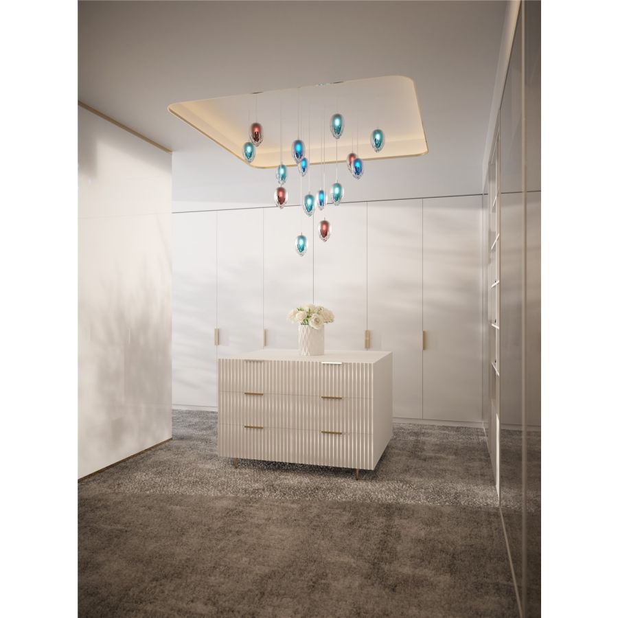 The GEM collection harnesses the latest glass-cutting techniques to create dazzling pendants in deep jewel hues of Aquamarine, Emerald and Dark Heliotrope. Each component is cut and polished to create the ultimate luxury piece for your interior.