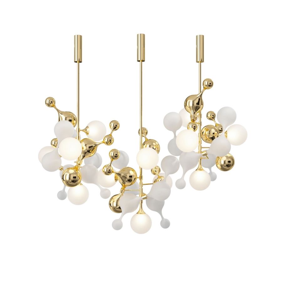 The PARTICLES collection features magnificent chandeliers formed of interconnecting complex glass shapes inspired by the microscopic design of powerful joy hormones – serotonin, dopamine and adrenaline. The glass components are finished in crystal, sandblasted and aurum nanocoating and fitted around a polished brass stem, to create bold artistic centrepiece for your space.