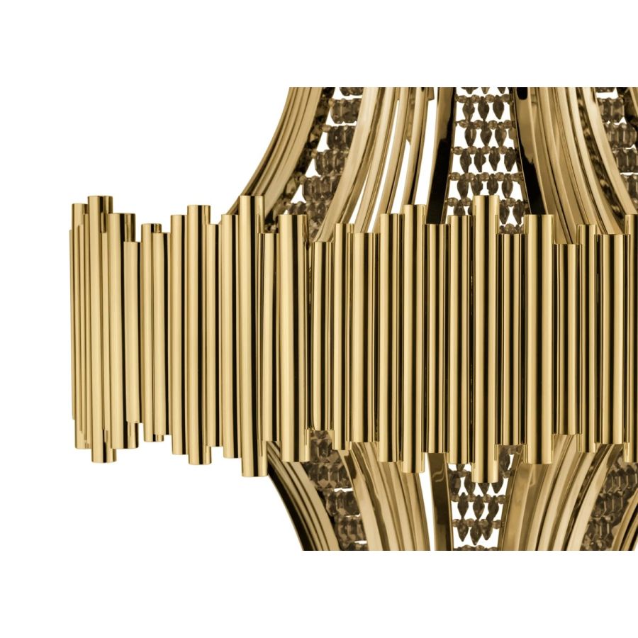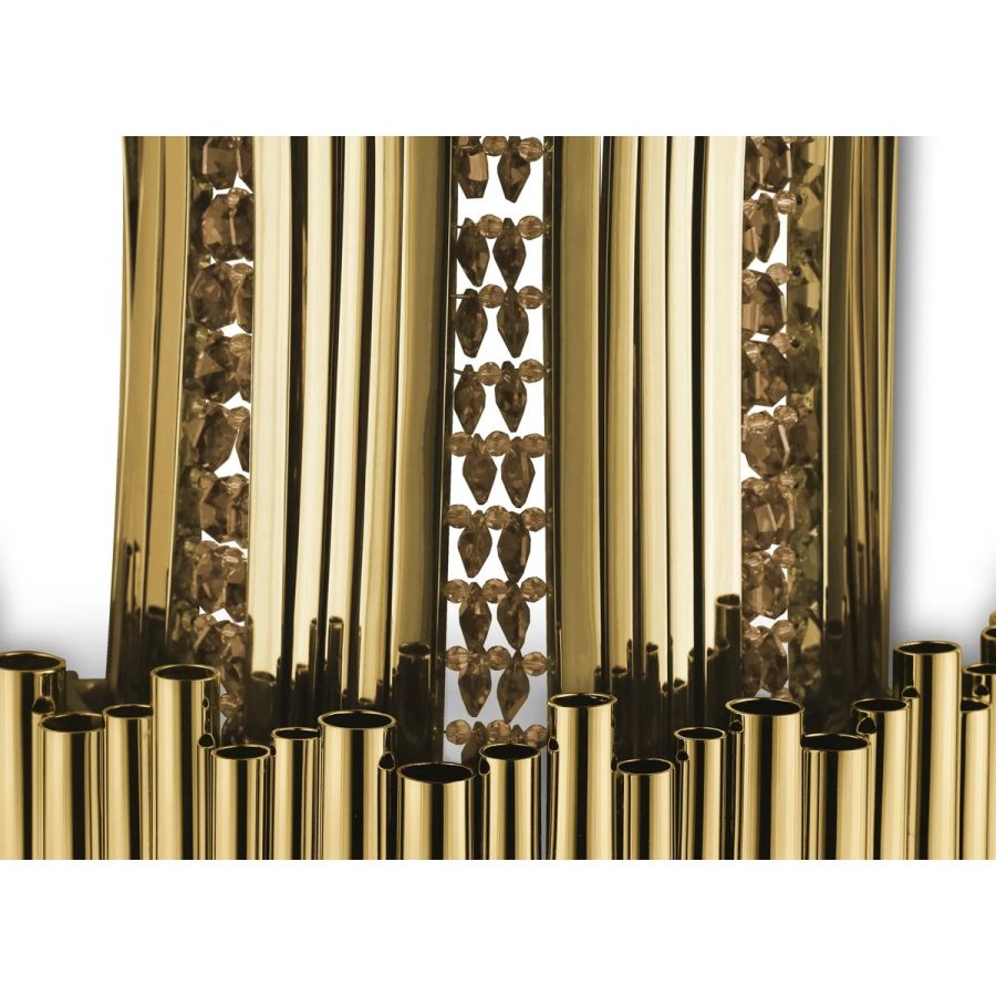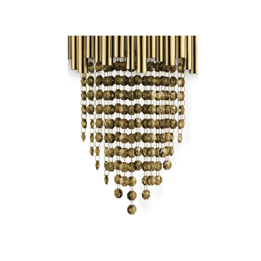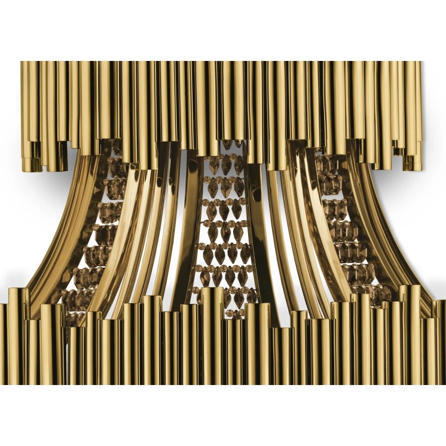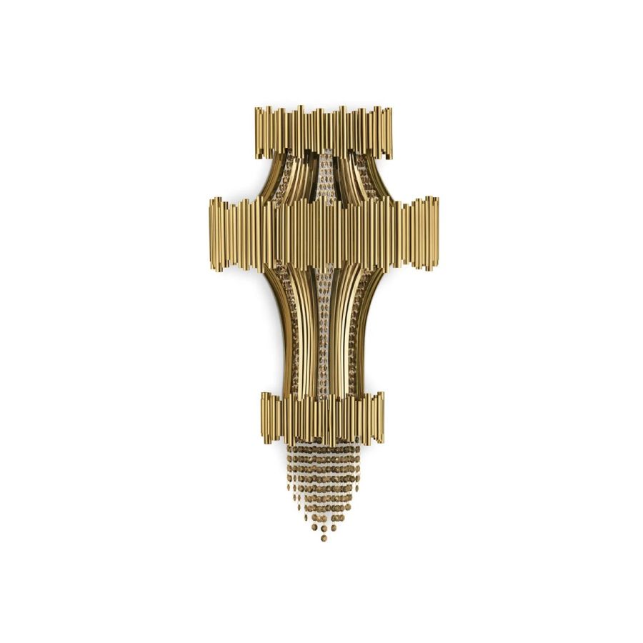 Elegant and luxurious wall lighting item, as incomparable and impressive as the romantic details of crystals. Poetically made in gold-plated brass with the handwork techniques of the craftsman, the Scala Wall Lamp will bring warm light to any dining or living room set, involving you in passionate emotions.