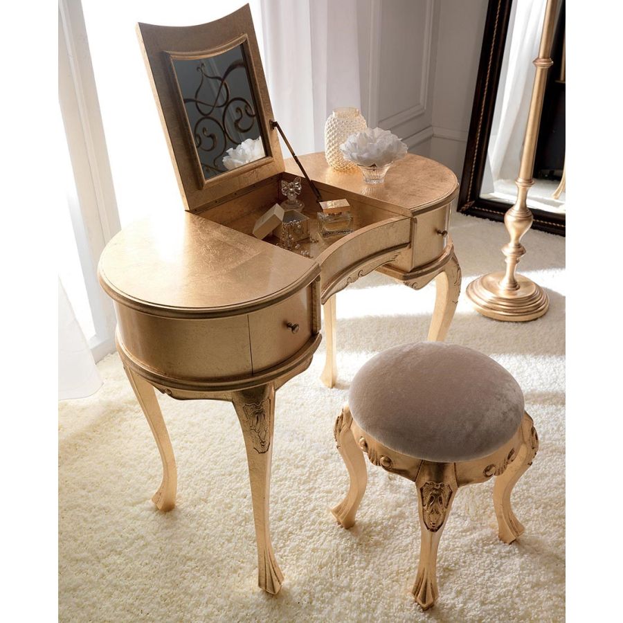 Classicwooden dressing table with 2 drawers and pull-out mirror, with solid carved wood legs.Gemma dressingtable is an indispensable addition to any elegant and refined bedroom. Available in a wide choice of finishings it is perfect both for classic, neo classic and chic settings.