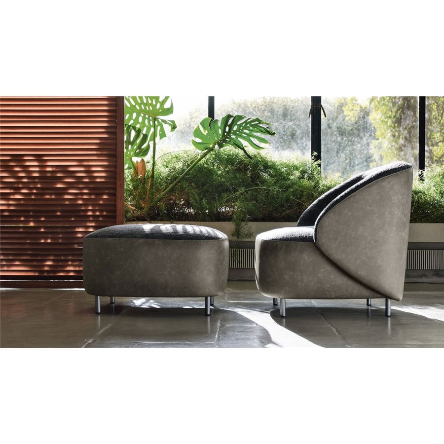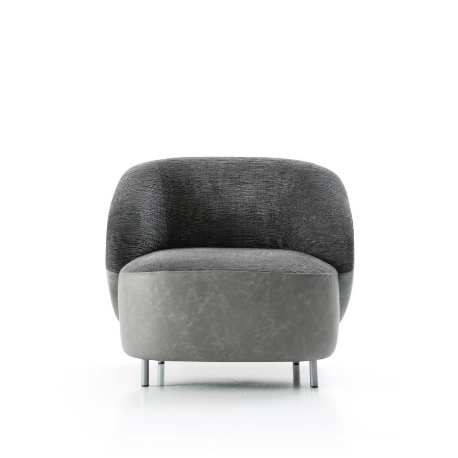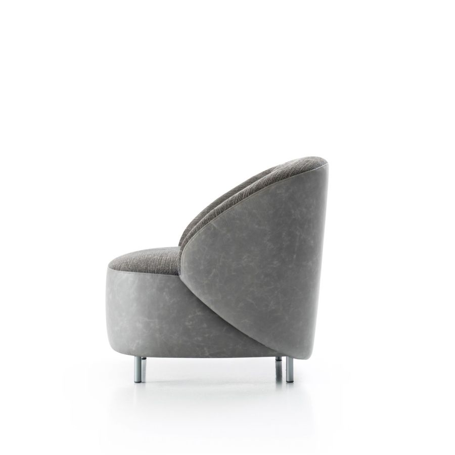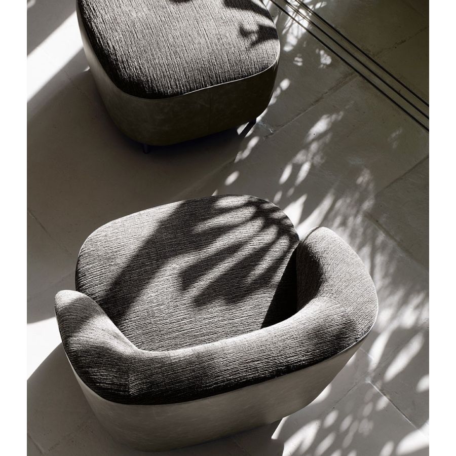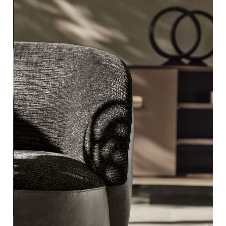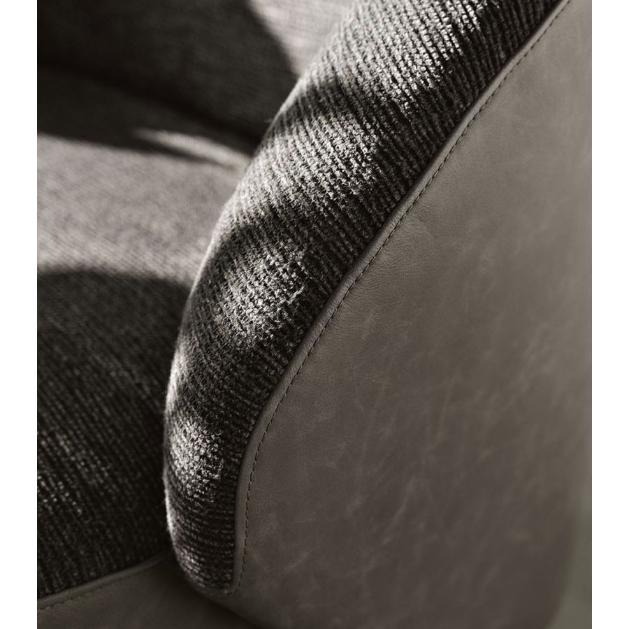 The harmonious design of Pandi plays aesthetically on a combination of materials between the leather that follows the curve of the enveloping backrest, which in turn becomes the armrest, and the fabric of the couture imprint of the cushions. With the natural elegance of its presence, Pandi is perfect for residential interiors, but reveals a strong hospitality attitude, thanks to its compositional versatility. The enveloping and harmonious shape of the seat is supported by a simple metal foot decorated.