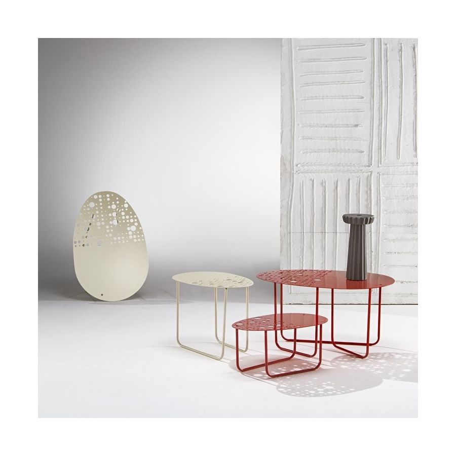 Kännetecknas av en lätt rörformig struktur och en utskuren metalltopp, har dessa inredningsaccessoarer en stark karaktär som kan passa i alla typer av miljöer, från minimalistiska till klassiska. Producerade i många versioner, både målade och omålade, är de det senaste måste-ha. På grund av deras lilla storlek är de lämpliga att användas som ett enskilt bord i en loungeversion eller kan grupperas tillsammans för att bilda en stor vardagsrumsyta.