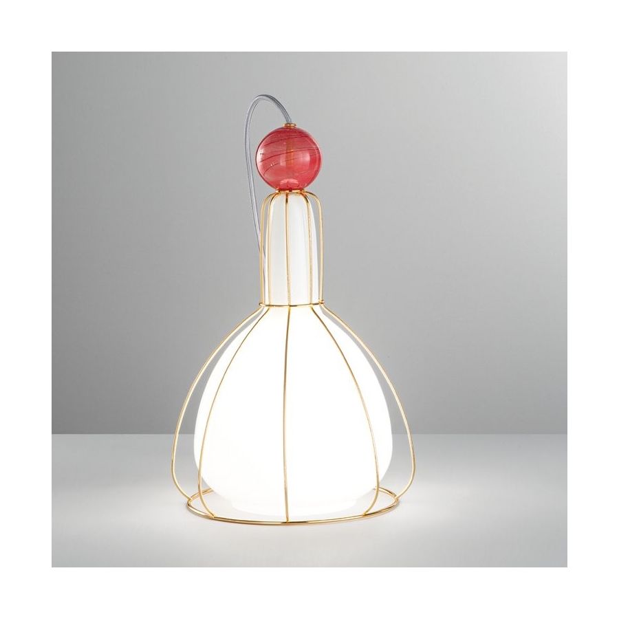 Dama, bordslampa som kan förekomma i andra versioner, berättar om andra tider inspirerad av de antika lyktorna vars linjer den återtolkar på ett samtida sätt. Med en stark närvaro, i sin mjuka och eleganta design, tycks metallstrukturen varsamt avlägsna glaset och vilja klä det: de två materialen möts, men är idylliska.