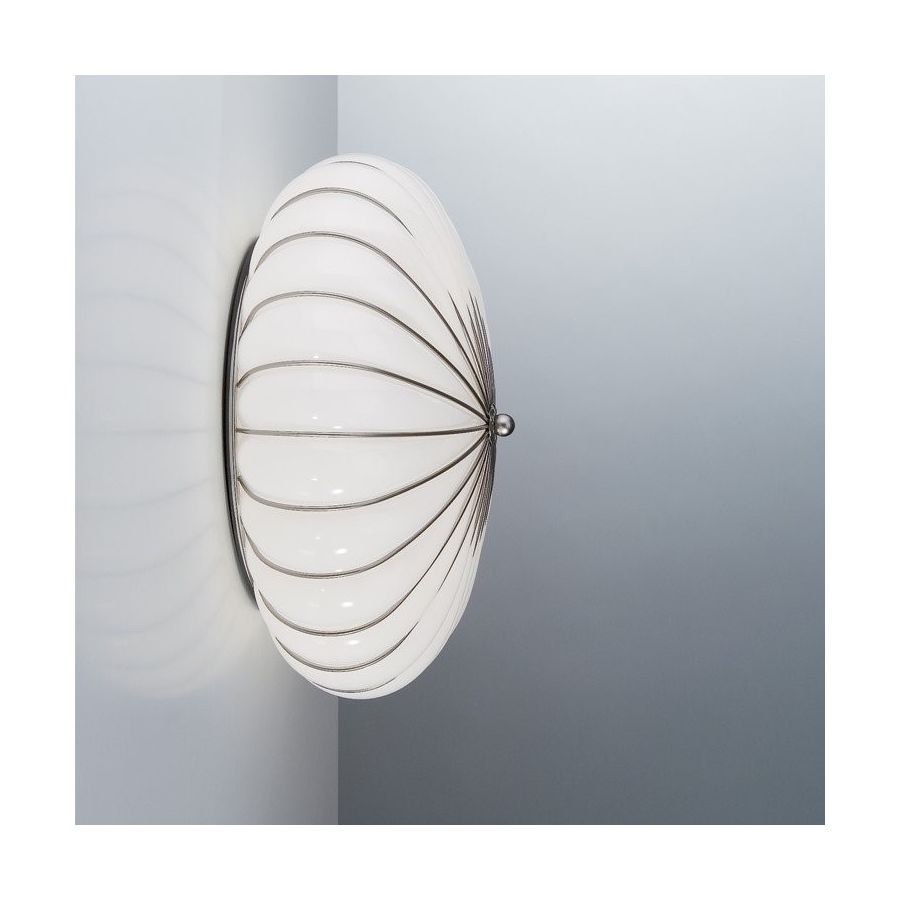 Utifrån en design tydligt inspirerad av klassikerna inom venetiansk glaskonst är Giove en ståtlig armatur som passar både som taklampa och som vägglampa. De tjocka metalltrådarna, arrangerade i en cirkulär form, markerar den viktiga och konsekventa aspekten som gör denna pjäs lämplig för alla stilfulla bostads- eller kommersiella miljöer.