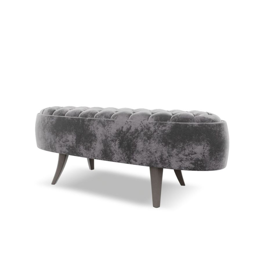 The Papillon bench stands out for its refined oval line with a surface entirely worked in capitonné. The saber-shaped wooden leg can be decorated in all the finishes in the sample book.