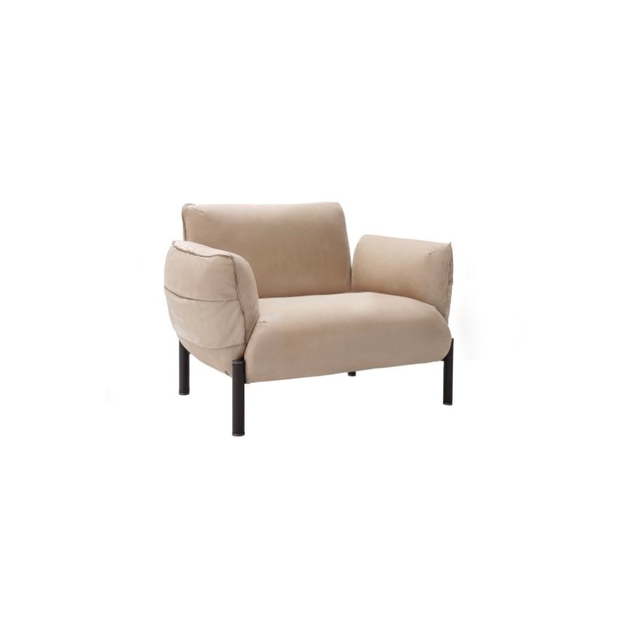 Fix padded armchair with differentiated polyurethane foam densities, steel legs covered with “testa di moro” hide, charcoal grey finishing details.