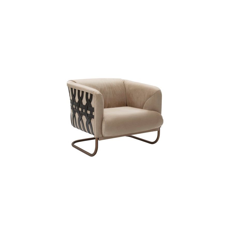Fix padded armchair with differentiated polyurethane foam densities, woven hide details, matt glazed effct steel base.