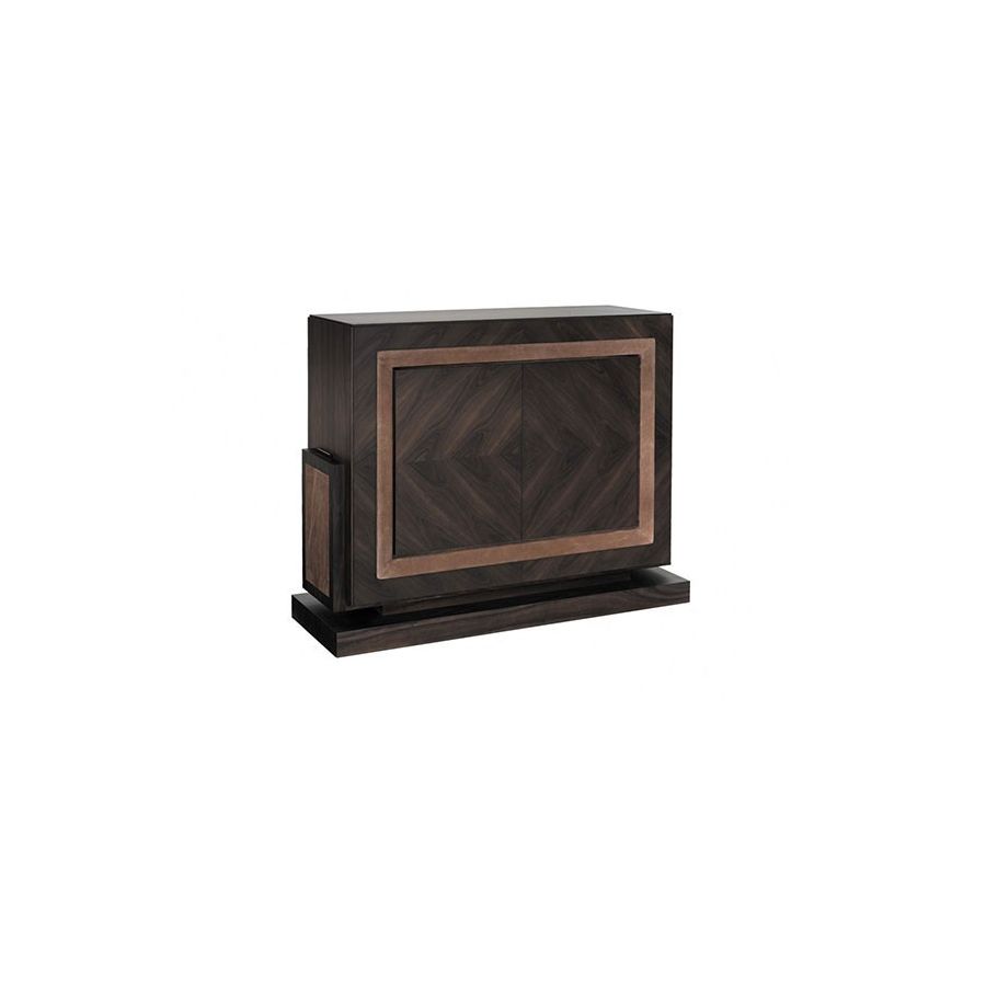 Efeso is pure decorative alchemy: elegant wood and soft leather merge to create this cabinet perfect for luxury living rooms. The internal light that reflects on the mirror creates radiance pleasurably in contrast with the dark hues of the outside.