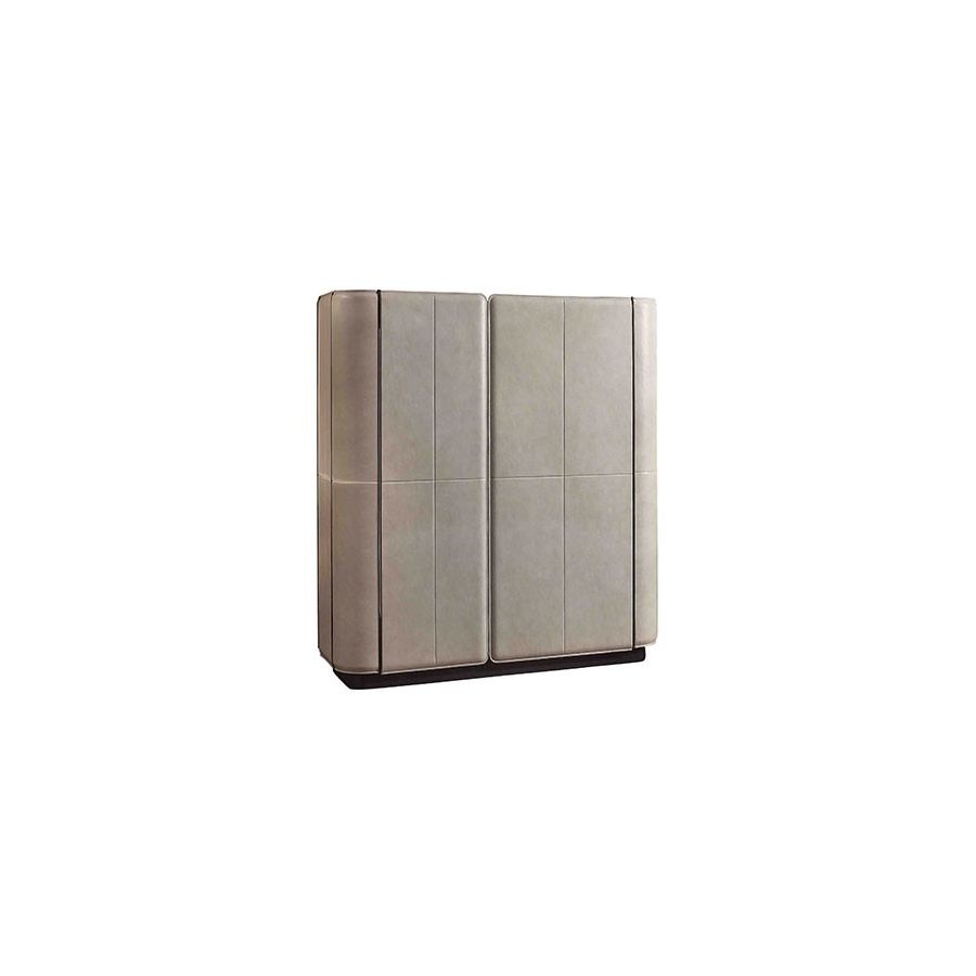 Inside a trunk made up of elegant wood and soft leather resides a treasure of conviviality and refined reflections. This bar unit is the harmonious contrast that provides functionality to your luxury furnishing. It can hold crystalware, excellent bottles and all the tools you need to share the pleasant company of friends and guests. The comfort provided by the pull-out shelf and the backlit mirror elegantly complete the refinement of this piece of furniture for modern living rooms that also contemplate classic style. These characteristics are concealed by the soft grace of the leather-upholstered doors.
