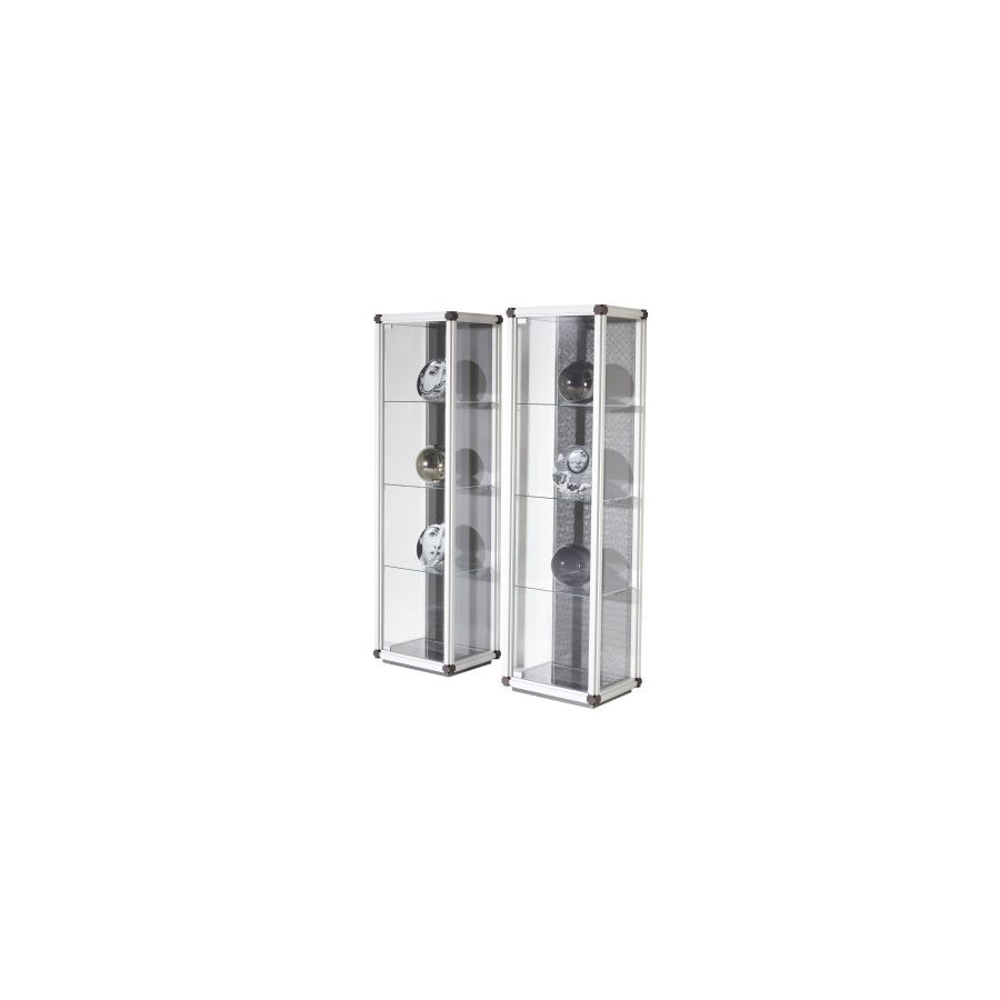 Cabinet in sand walnut or tobacco oak, door, sides, and shelves in tempered glass, anodized aluminum profiles, walnut details, interior lighting.