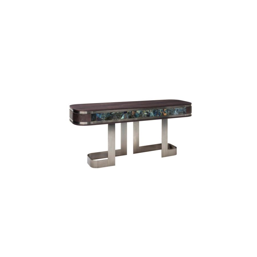 Coordinated console: it can perfectly complete the dining room with Paul and Gatsby. Belt in glazed effect or painted steel. Drawers with customizable front in precious gemstone or wood.
