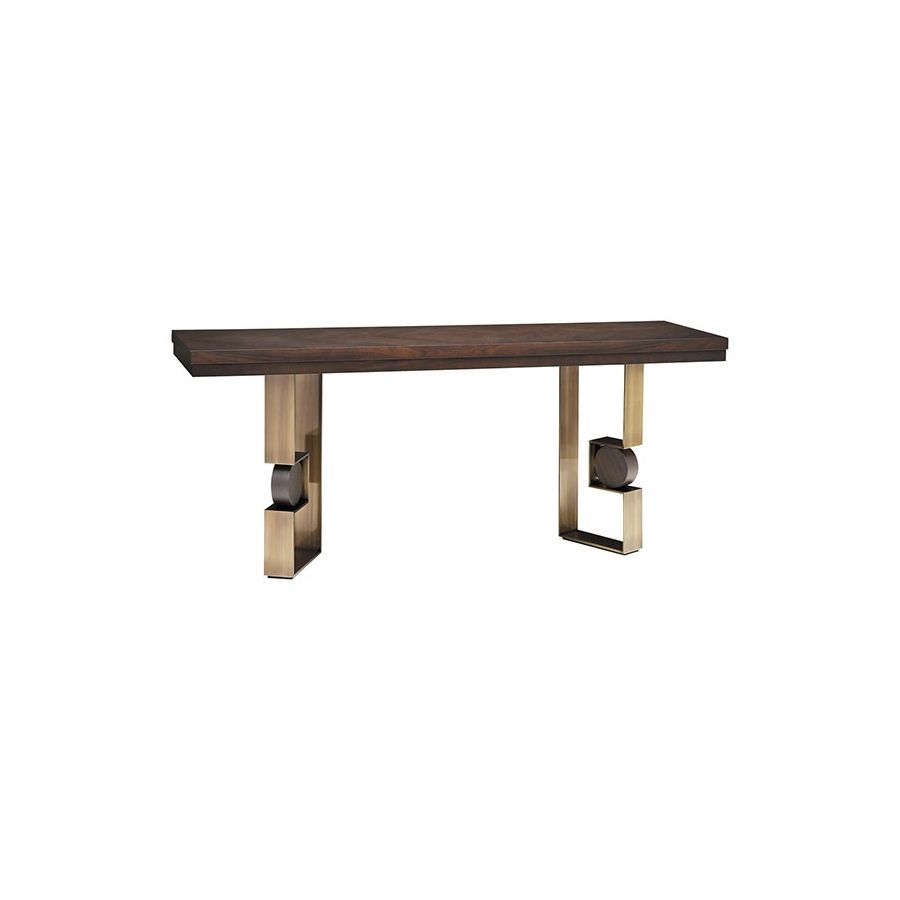 With its distinctive aesthetical balance, Rodrigo is extremely unusual and immediately stands out in every luxury hall. Its linear structure expresses a unique geometrical and material balance especially in the legs where the right angles formed by the straight lines host perfect circles. The play of empty and full spaces is underlined by the use of two different materials: metal and wood.