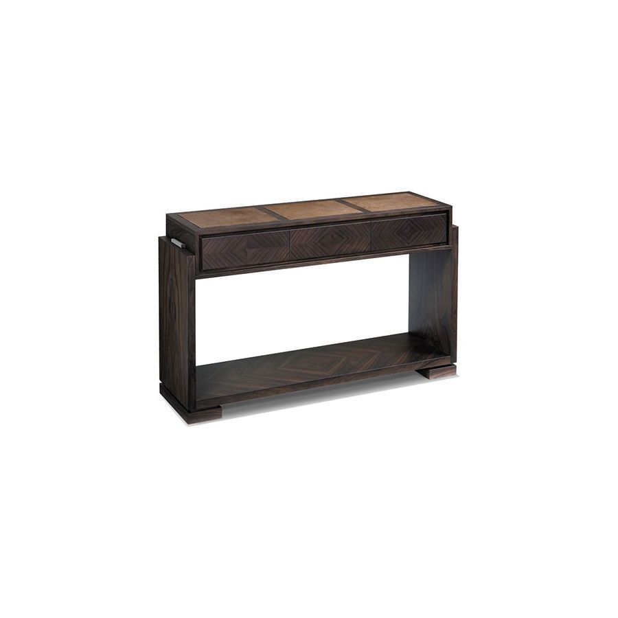Wooden console table with 3 drawers and steel details.