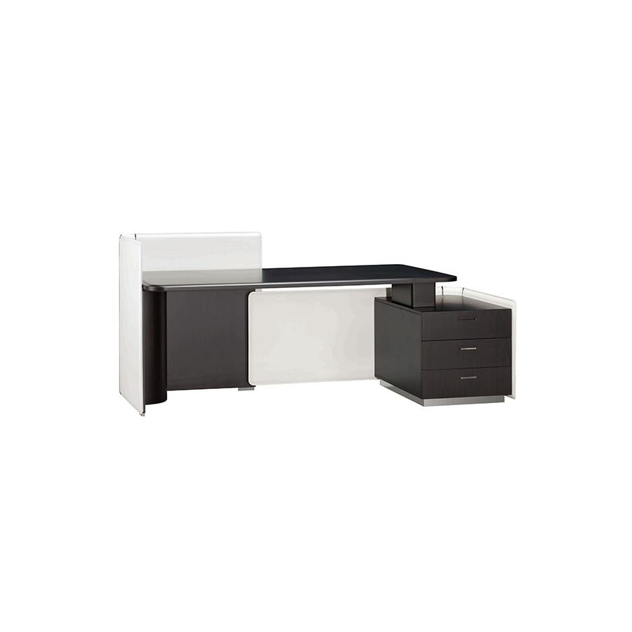 The structure is designed to express innate grace and enhance the work of who is using it. Its wide size includes three drawers and a comfortable modesty panel. Some smooth lines and rounded edges complete the persistent but delicate fusion of the three materials.