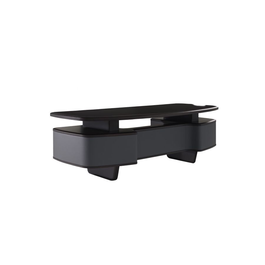 Desk in matte rosewood or matte tobacco rosewood and leather, 4 drawers, details in polished black nickel.