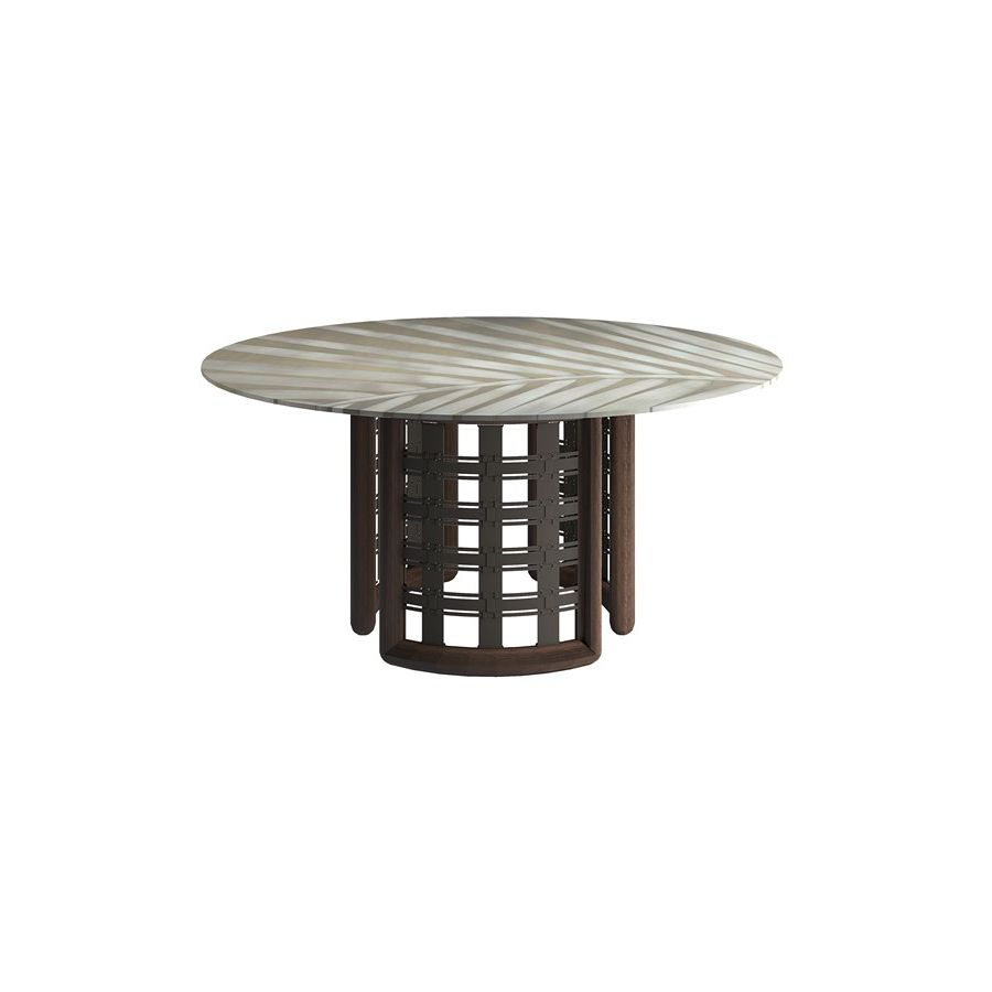 Tinted solid ash wood round high table with woven hide details, bronze tempered glass top dia.160 cms mm.12 th.