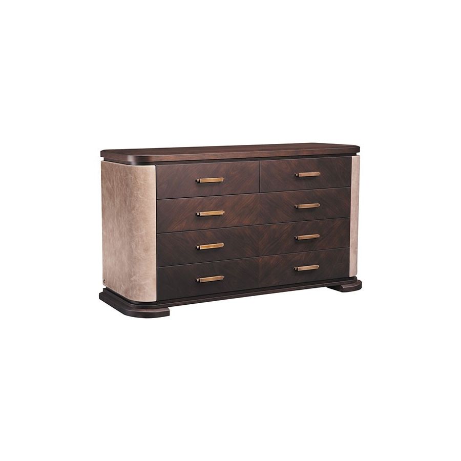 Wood chest of drawers with leather sides, 5 drawers and steel details.