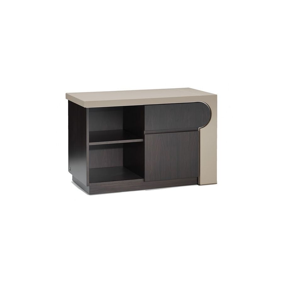 Lock is an essential piece of furniture for the perfect executive office. The drawer is designed to hold little objects while the door and the 2 shelves store what you use frequently. Woodand leather meet creating a harmonious contrast that reflects the curved and straight lines of the Lock series. These two wonderful materials are enriched by the metal.