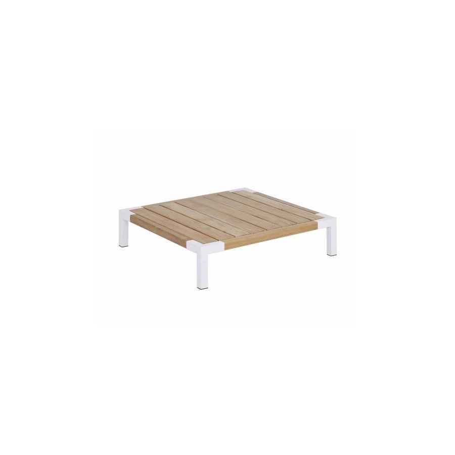 Rectangular outdoor coffee table made of wood, frame made of super-matt powder-coated aluminum with an embossed effect.