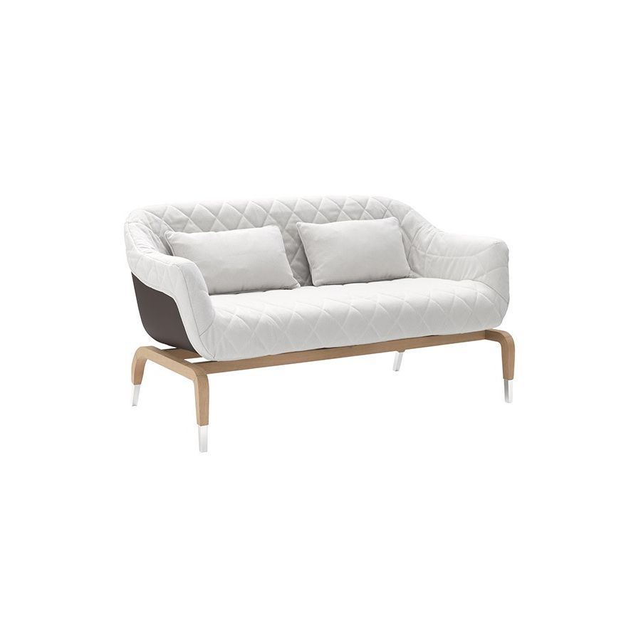 Fixed upholstered sofa with "EcoSun" finish, no. 2 lumbar cushions in outdoor fabric, teak base with polished steel details.
