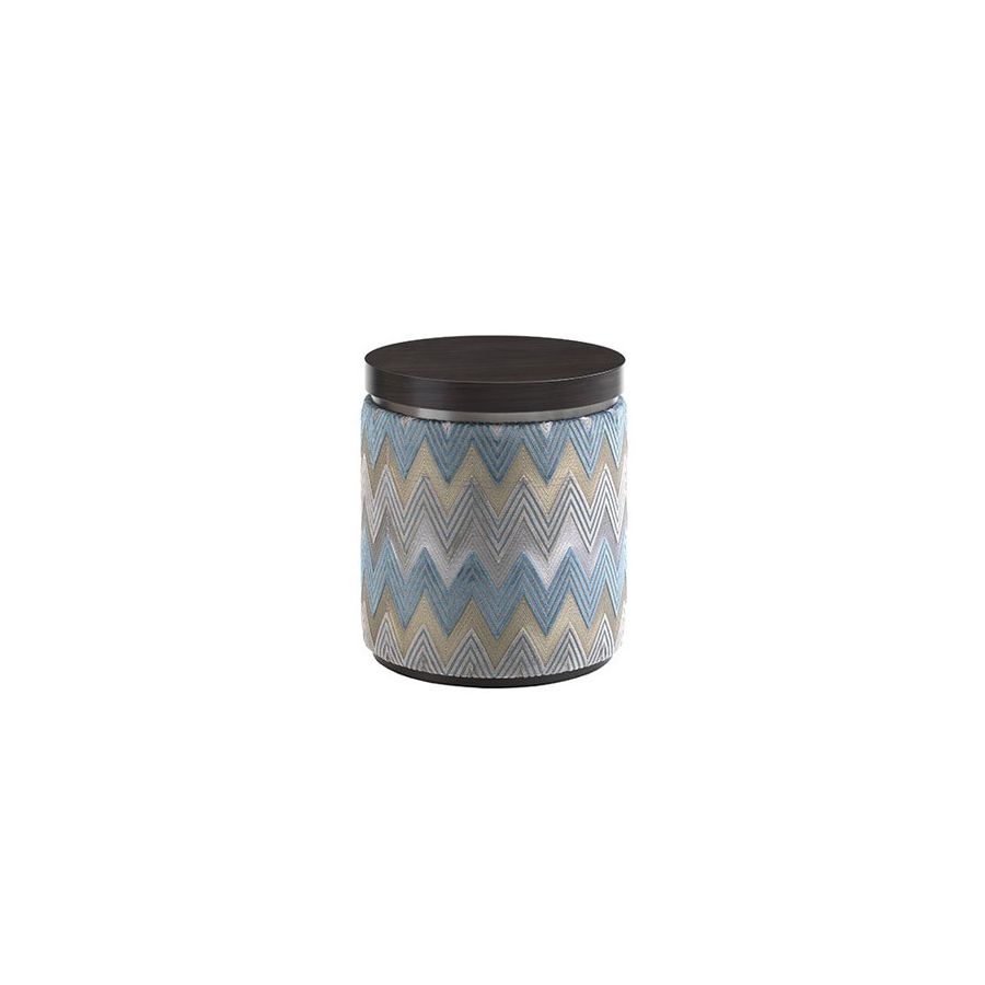 The perfect contrast of different materials expresses through the refined rounded lines of the table: the wooden structure reveals in the table top and the base, while the bright Bargelo fabric paints the structure with blue, white and golden lines, further enhanced by some shining reflections. Rays of lightand metal reflections under the table top do not go unnoticed.