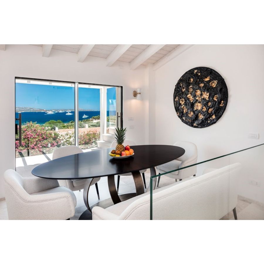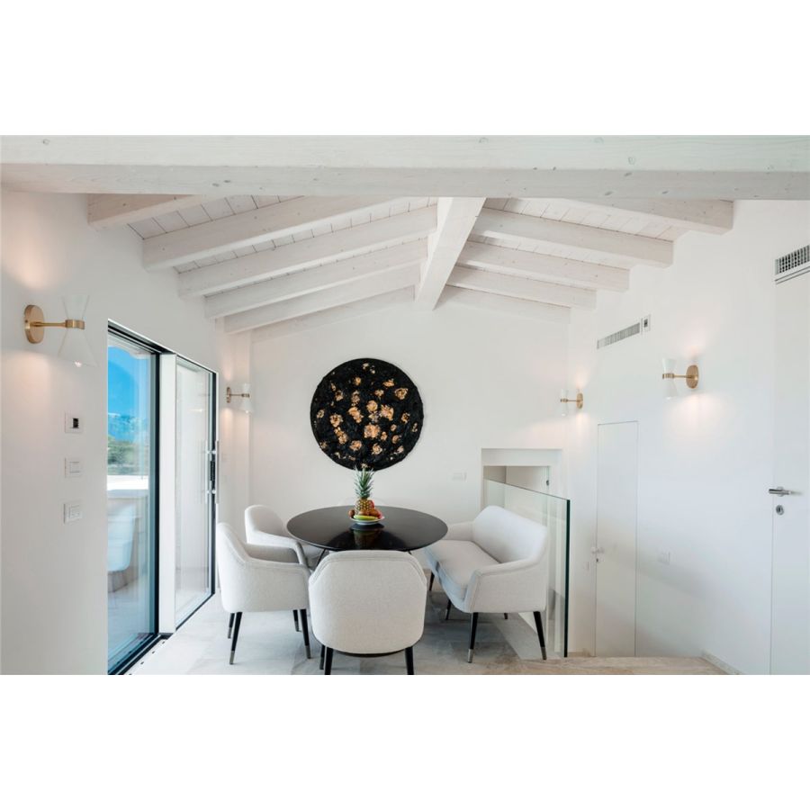 Bernadette-matbänken har ett delikat avtryck av sjuttiotalet. Bekväm och avslappnad i sätet fascinerar den med den förfinade formen på benen, vars lackade trä mynnar i en metallspets: en förförisk och självsäker detalj, som ett medbrottarlikt leende. Matfåtöljen ingår i en familj som även omfattar en matstol, en fåtölj, en barstol, en liten soffa och en puff. På grund av uppmärksamheten på skräddarsydda detaljer och hennes ädla personlighet förkroppsligar Bernadette DOM Edizioni-filosofin på bästa sätt.