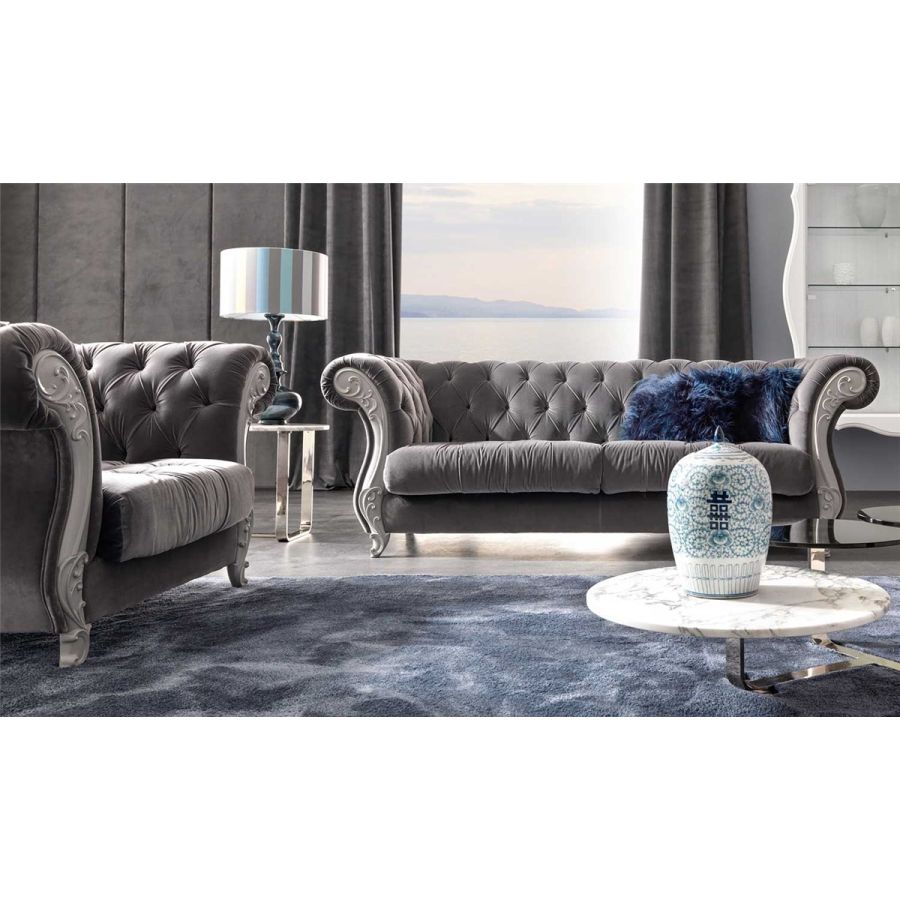 Solid poplar structure. Carved and hand polished armrests and feet made of solid beech wood. Capitonné padding with crushproof differentiated density rubber, Upholstered in fabric, leather or eco-leather.