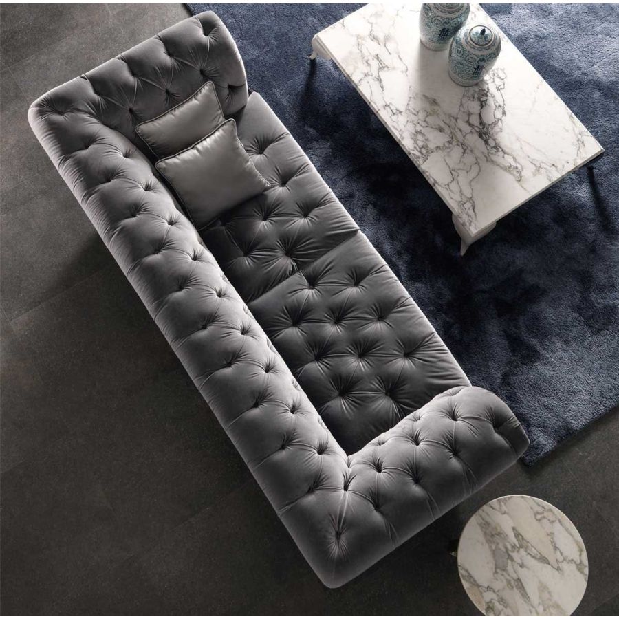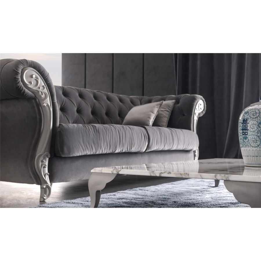 When a classic line joins original, new and innovative ideas; Gabriel sofa is born to re-fresh a traditional style with exclusive, stunning modern finishes, thanks to the use of design and contemporary fabrics and details. The soft and voluminous capitonné padding featured with the carved solid wood armrest, create a lively proposal and a sensational confidence. A mix of creativity and high quality making every setting unique. Loose cushions included.