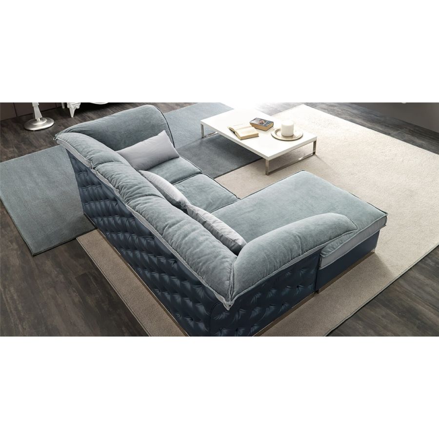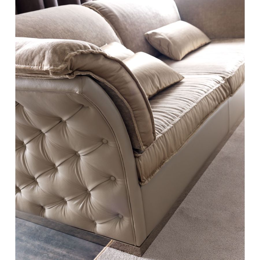 Solid poplar structure. Capitonné padding and cushions made of crushproof differentiated density rubber. Upholstered in fabric leather, eco leather Blockbord fir plinth, mdf veneered, or hand polished iron plinth.