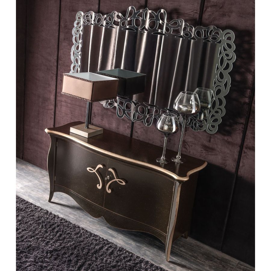 An important mirror with classic shapes characterized by the motif on the glass that reproduces a complex embroidery. Available in a natural, bronzed or smoked finish, the mirror surface is supported by a wooden panel that follows its empty lines, revealing the background on which it is hung. A piece of high manufacturing value, offering the greatest elegance and refinement to every interior.