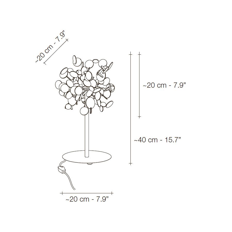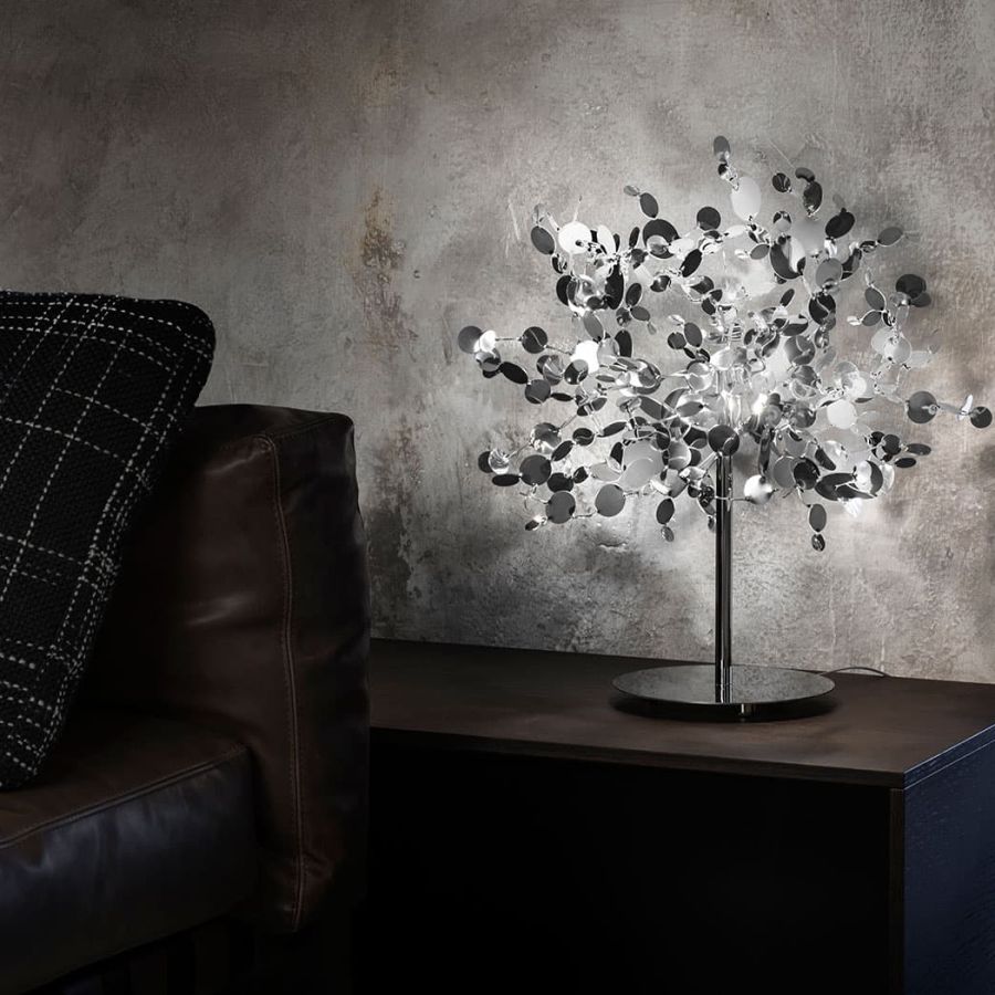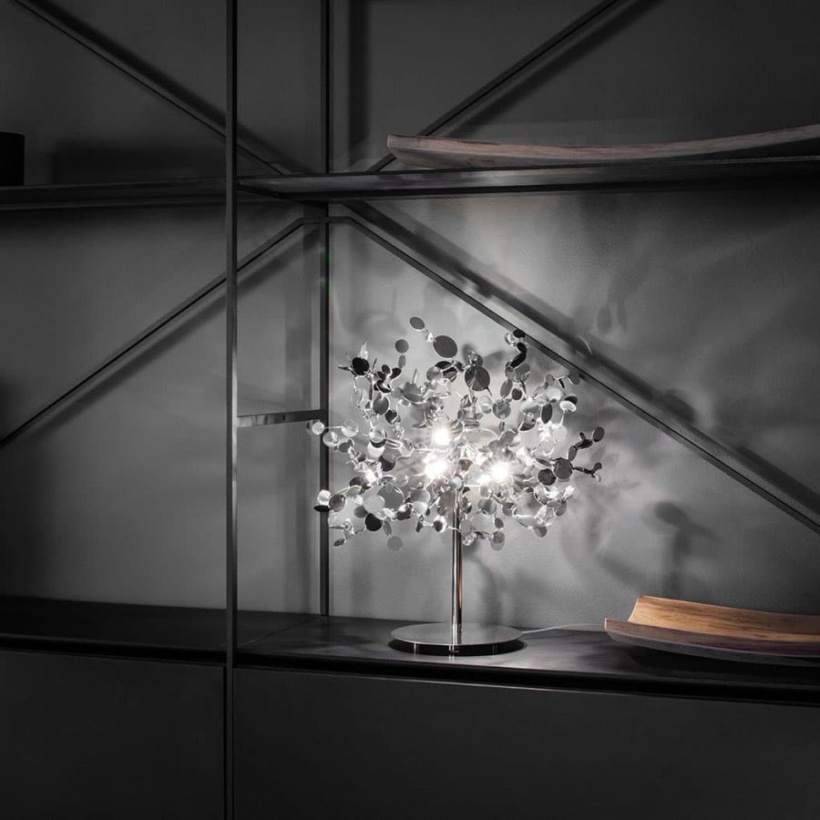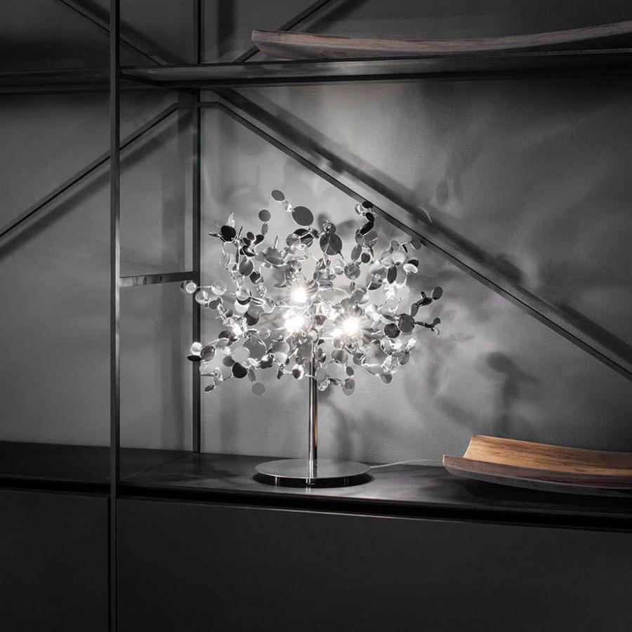 Argent dekorativ bordslampa designad av Dodo Arslan för Terzani. Argent består av metalldiskar som noggrant formats för hand av Terzanis hantverkare till kluster. När den tänds avger de flera vinklade ytorna på skivorna ett mjukt, skimrande sken. Argent finns i champagne, rostfritt stål, guldpläterad och roséguld.