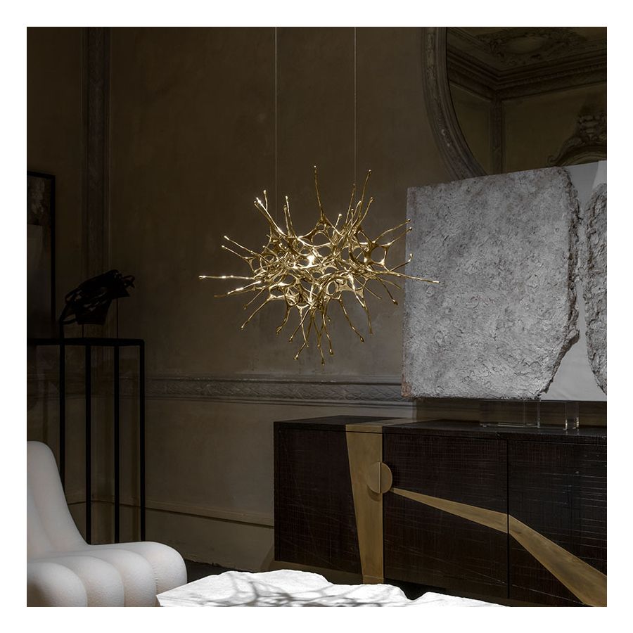 Dragon representerar ett nytt kapitel för Terzani: det första föremålet designat som en fristående skulptur i mässing, gjuten på ett historiskt gjuteri i Toscana. Hos Terzani gynnas vår kreativa process av dialogen som skapas mellan vår historia, våra kreativa samarbetspartners och vår innovativa anda. När vi skapade Dragon fann vi att det mest kraftfulla uttrycket inte var som en belysningsdesign utan som ett skulpturalt konstverk, ett som förhöjer konstnären och använder vår kreativa expertis. I kinesisk mytologi är draken en naturgudom som är central i skapelseberättelserna. Därför är det logiskt att det senaste från designern Dodo Arslan hämtade intryck från denna kraftfulla, urgamla symbolik för sin senaste skapelse. I en dramatisk omprövning av hur rum upplevs är Dragon en skulptur utformad för att inte bara fånga uppmärksamhet utan också förändra hur ett utrymme betraktas. En explosion av flytande metall, tämjda av Terzanis toscanska mästergjutare, speglar Dragon kraften från de eldar som formade den och talar om förbindelsen mellan jord och vatten. Detta handgjorda stycke förkroppsligar elementens cykliska dans samtidigt som det åkallar en kosmisk harmoni.
