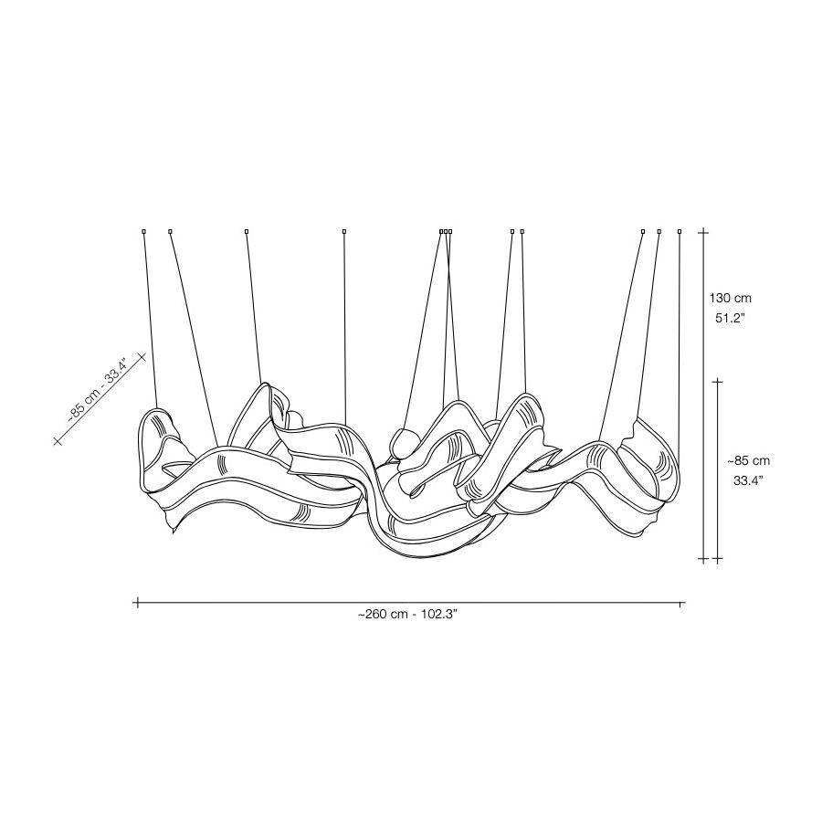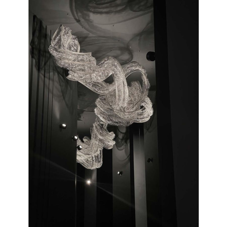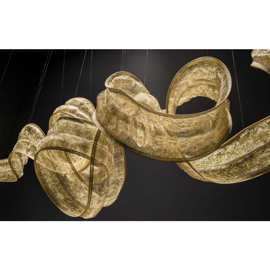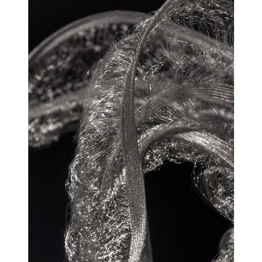Gianluca Regazzo har vävt sin vision, inspirerad av modets språk, till skapandet av ett tyg som svävar i luften, där elegans och kreativitet förenas i en eterisk och tidlös form. Genesis förenar textilkonst och belysning och ger liv åt ett verk som framträder ur en tunn tråd av stickat stål. Dess organiska väsen förvandlas till en visuell juvel, kapabel att bryta ljus i en ömtålig balans mellan lätthet och harmoni, förtrollande dem som skådar det.